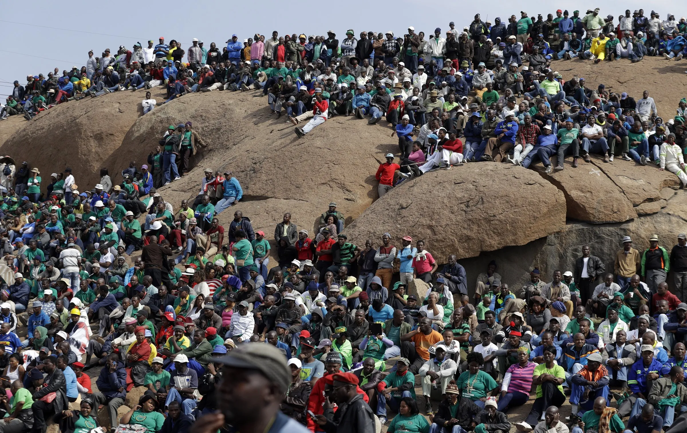 Mine workers sit on a hill during the commemoration near Marikana in Rustenburg, South Africa, Tuesday, August 16, 2016. On August 16, 2012 police shot and killed 34 striking Lonmin miners, apparently while trying to disperse them and end their strike. Ten people, including two police officers and two Lonmin security guards, were killed in the preceding week. (Photo by Themba Hadebe/AP Photo)