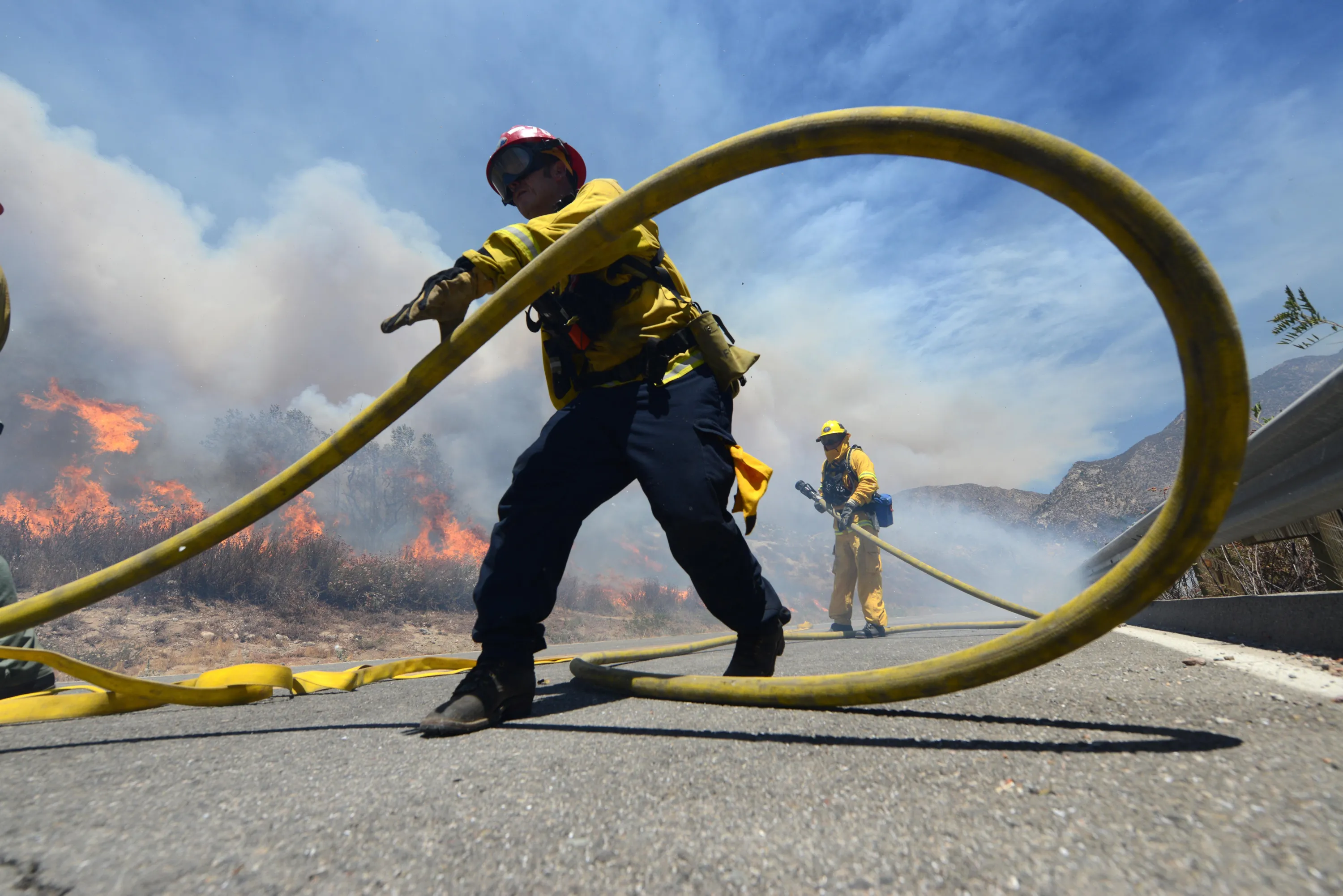 Firefighters battle the Bluecut Fire along Swarthout Canyon Road in the Cajon Pass, north of San Bernardino, Calif., Tuesday, August 16, 2016. Officials with the San Bernardino National Forest say five years of drought coupled with dry, hot weather have turned the entire area into a tinder box. (Photo by Will Lester/The Sun via AP Photo)