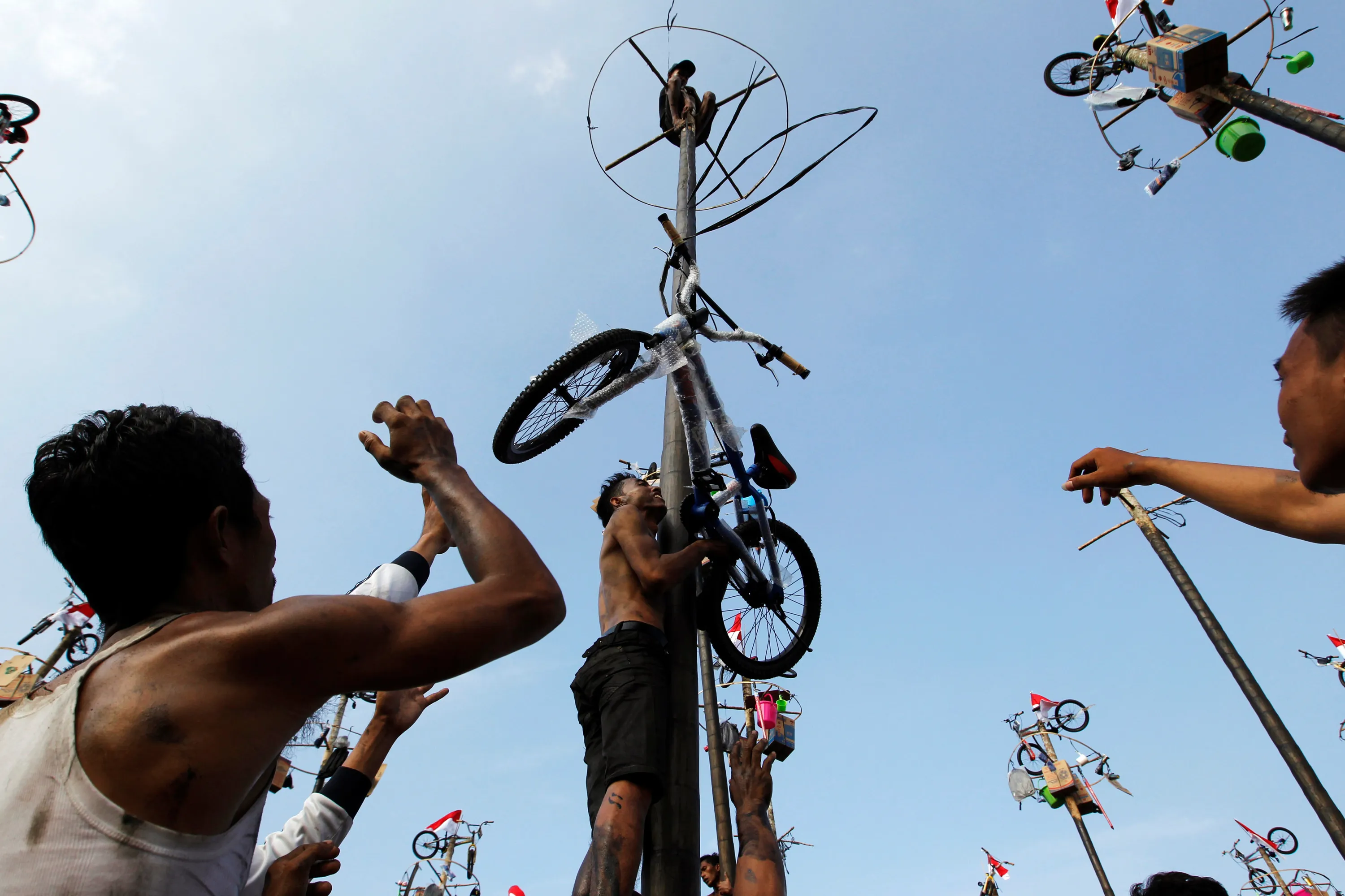 A participant lowers a bicycle after climbing a greased pole to collect prizes during a “Panjat Pinang” event organised in celebration of Indonesia's 71st Independence day in Jakarta, Indonesia August 17, 2016. (Photo by Iqro Rinaldi/Reuters)