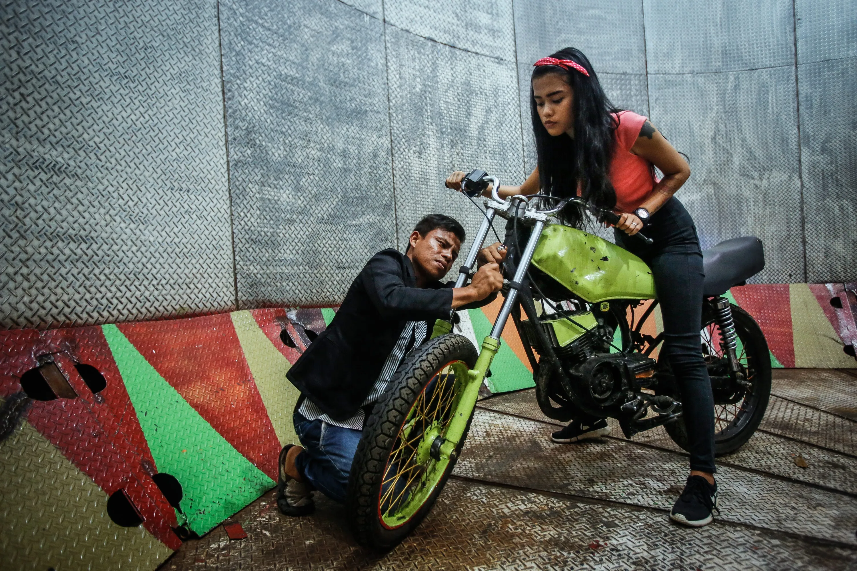 A picture made available on 16 August 2016 shows a young dare devil motorbike rider, Karmila Purba, 18, and her mentor Tora Palevi checking her motorbike before the show time of “Tong Setan” or Davil's Barrel show, at a traditional night carnival in Deliserdang, North Sumatra, Indonesia, 11 August 2016. (Photo by Dedi Sinuhaji/EPA)