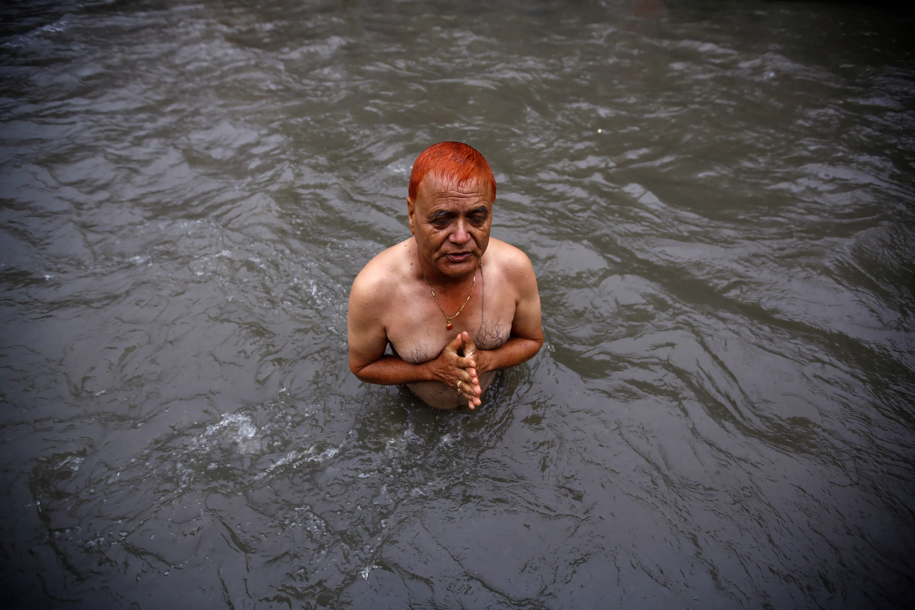 A devotee offers prayers standing in the Bagmati River flowing through the premises of Pashupatinath temple during the Janai Purnima, or Sacred Thread, Festival in Kathmandu, Nepal, August 18, 2016. (Photo by Navesh Chitrakar/Reuters)