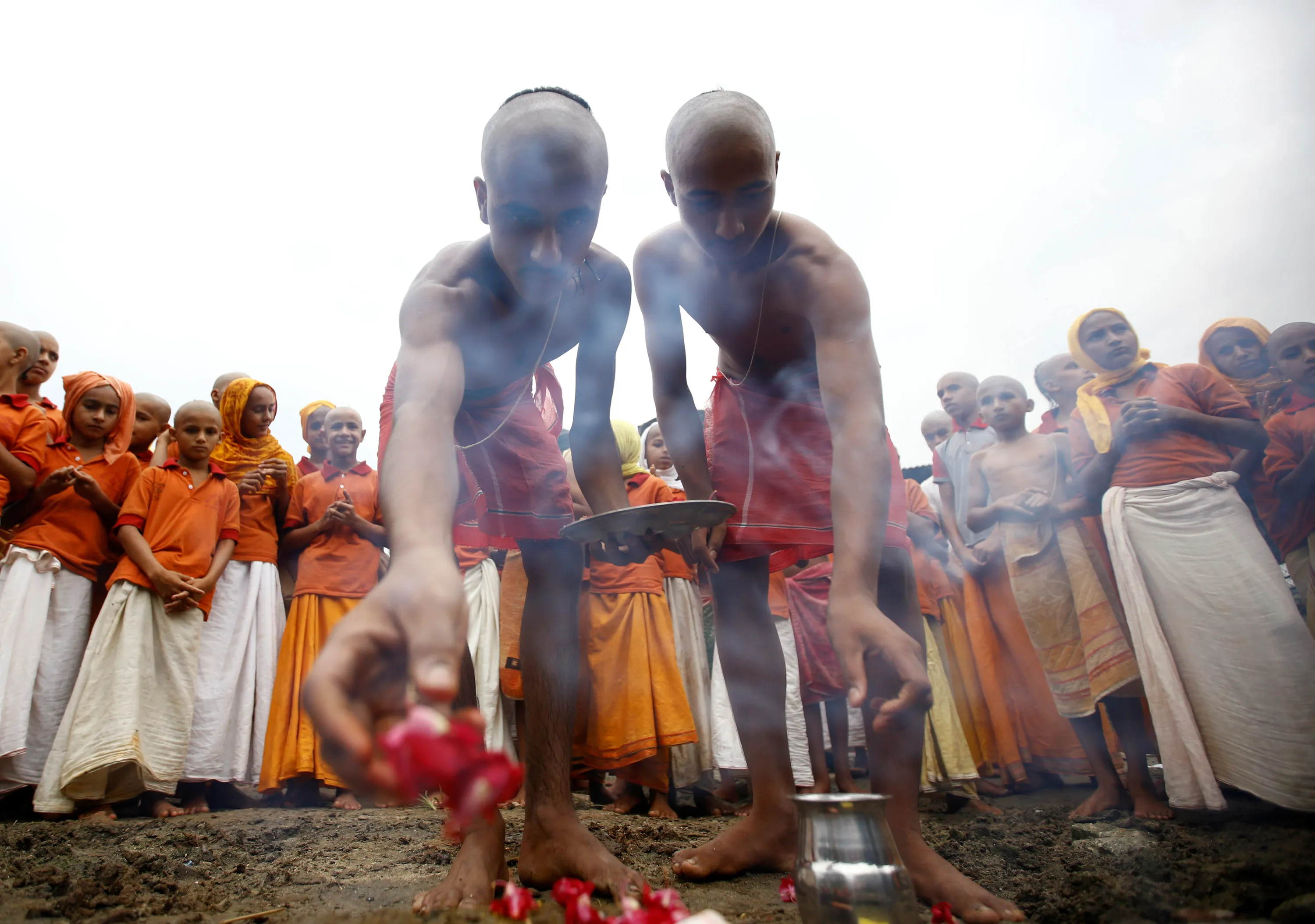 Hindu priests perform a ritual during the Janai Purnima festival (Sacred Thread Festival) at Pashupatinath Temple in Kathmandu, Nepal, August 18, 2016. (Photo by Navesh Chitrakar/Reuters)