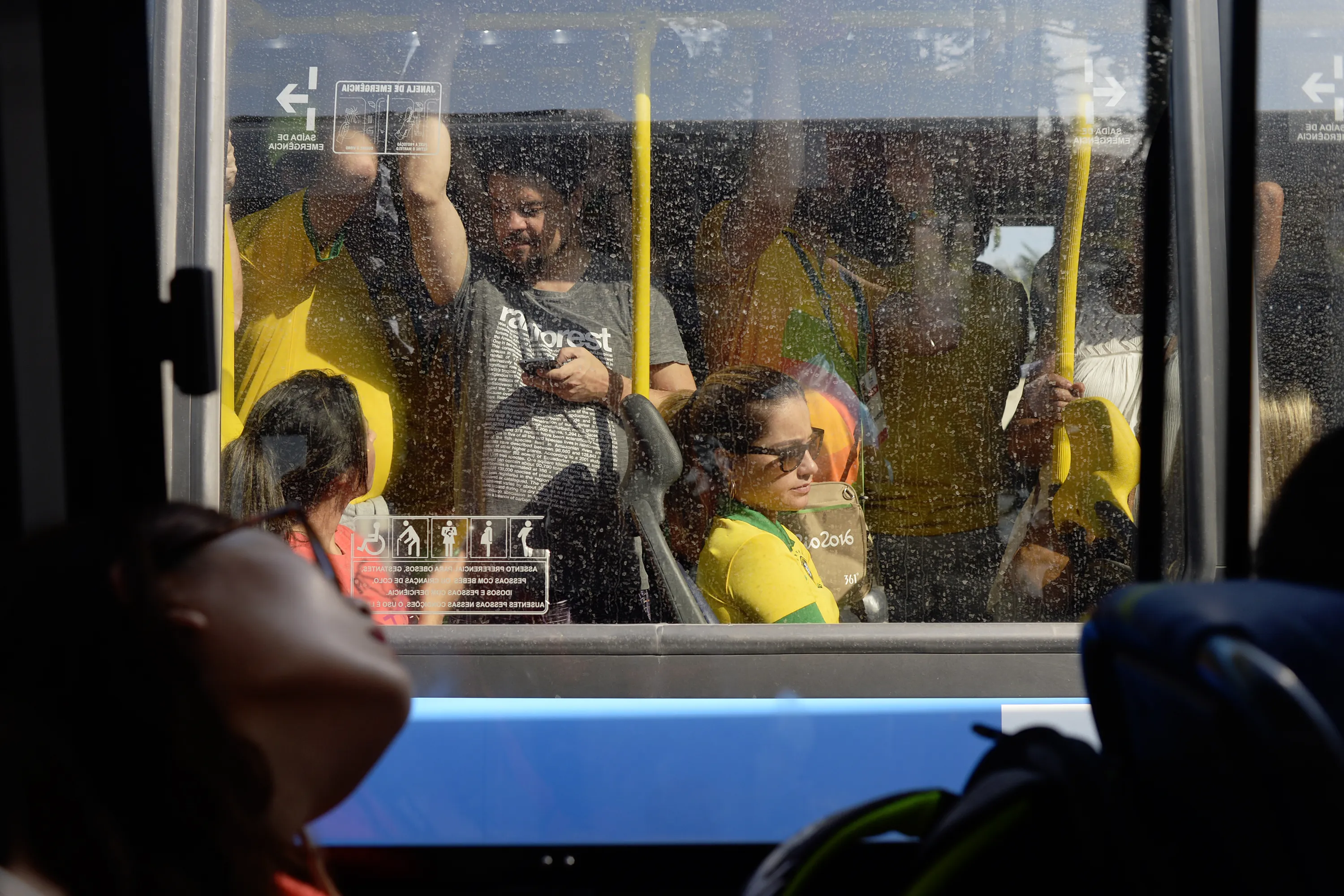 People are crammed onto a public bus as it passes the media transport shuttle outside of Olympic Park on Monday, August 15, 2016. (Photo by Aaron Ontiveroz/The Denver Post)