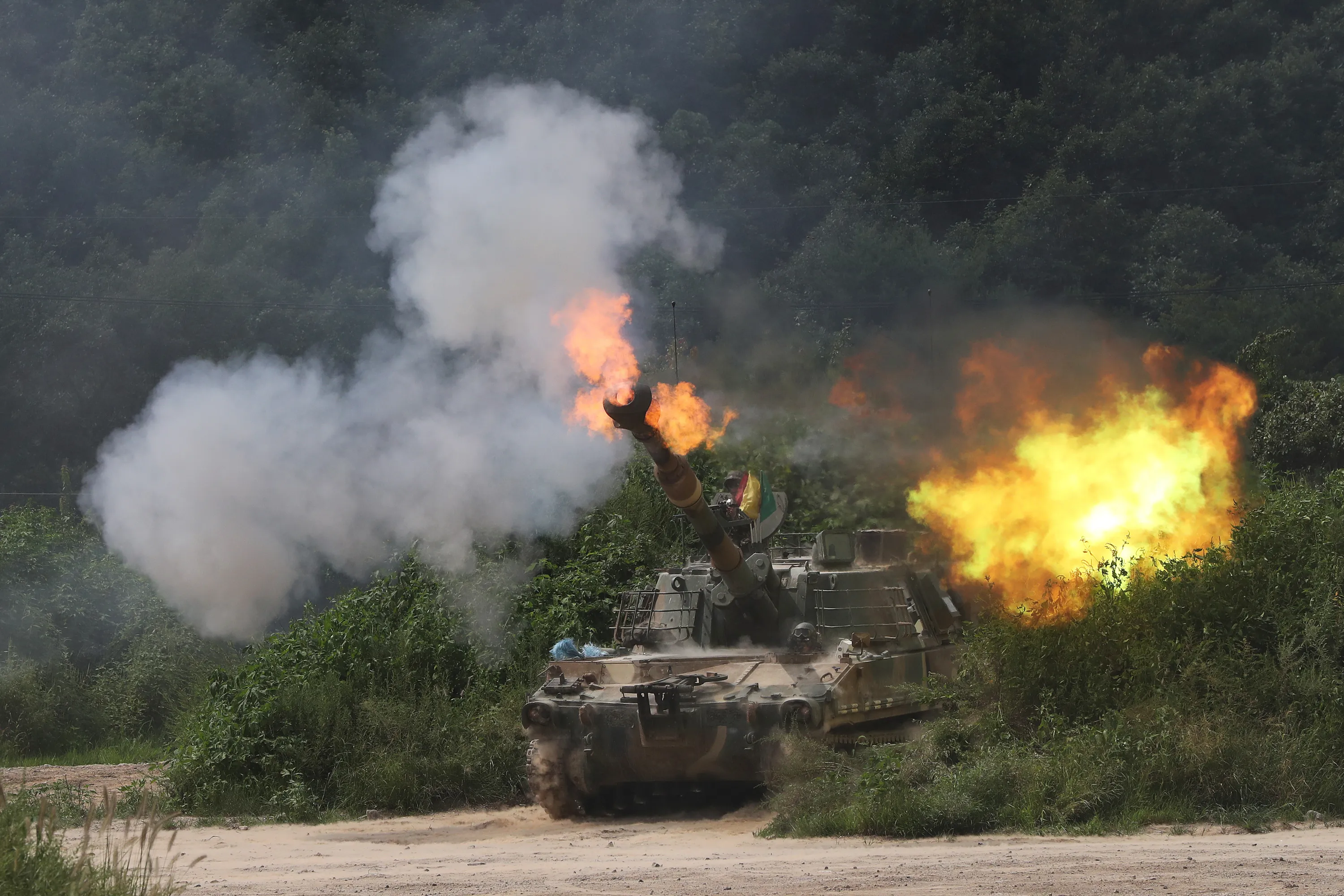 A South Korean army's K-55 self-propelled howitzer fires during a military exercise in Yeoncheon near the border with North Korea, South Korea, Thursday, August 18, 2016. South Korea's army says it has conducted its largest-ever artillery drills near the tense border with North Korea. (Photo by Lim Byung-shick/Yonhap via AP Photo)