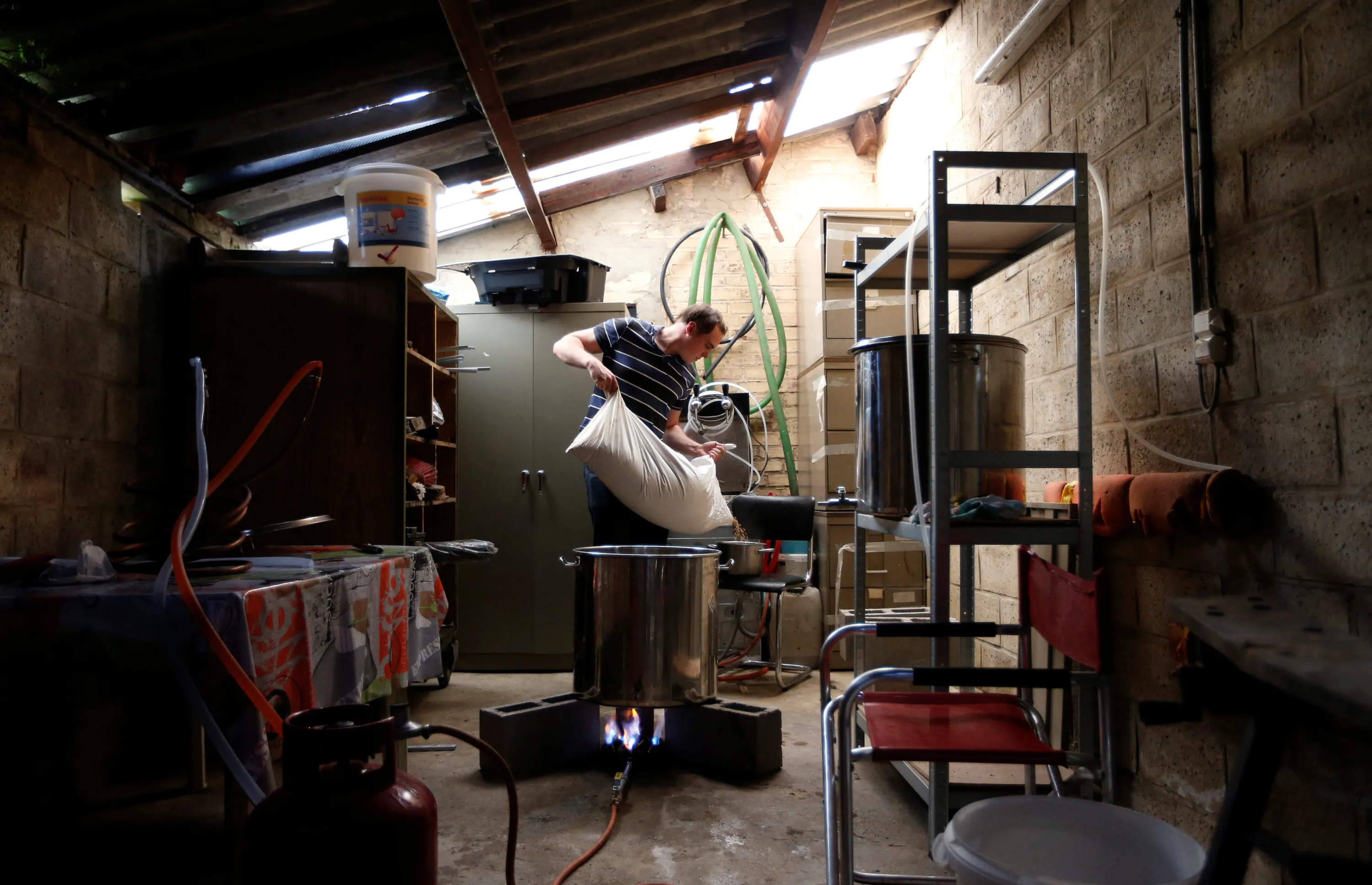 Jean-Christophe Larsimont, Vice President of the Belgian Homebrewers association, pours malt as he starts making his own beer in the garage of his house in Sambreville, Belgium, August 9, 2016. (Photo by Francois Lenoir/Reuters)