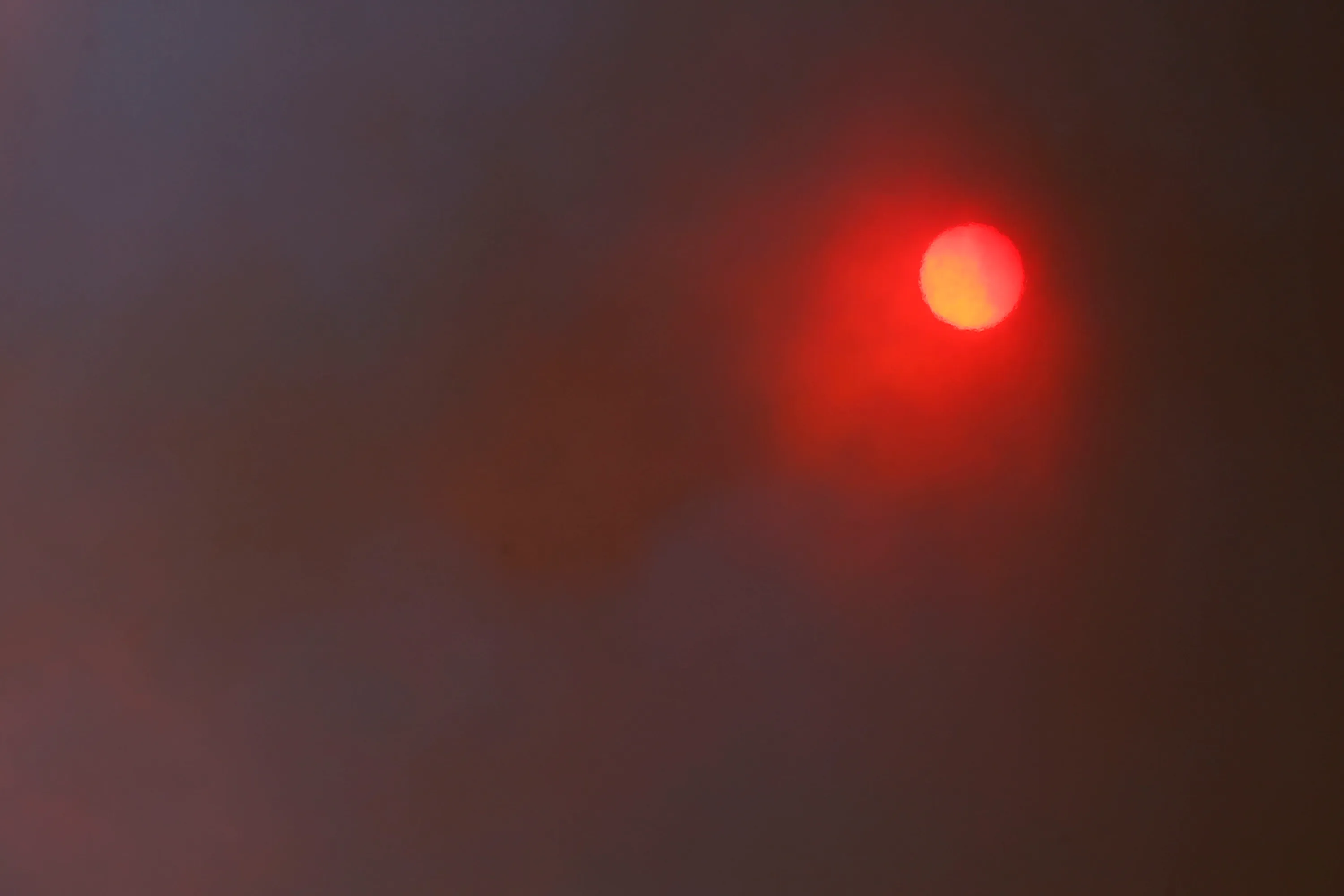 The sun appears a deep red as smoke from flames whipped by strong winds burn though a hillside during the Blue Cut fire in San Bernardino County, California, U.S. August 17, 2016. (Photo by Patrick T. Fallon/Reuters)