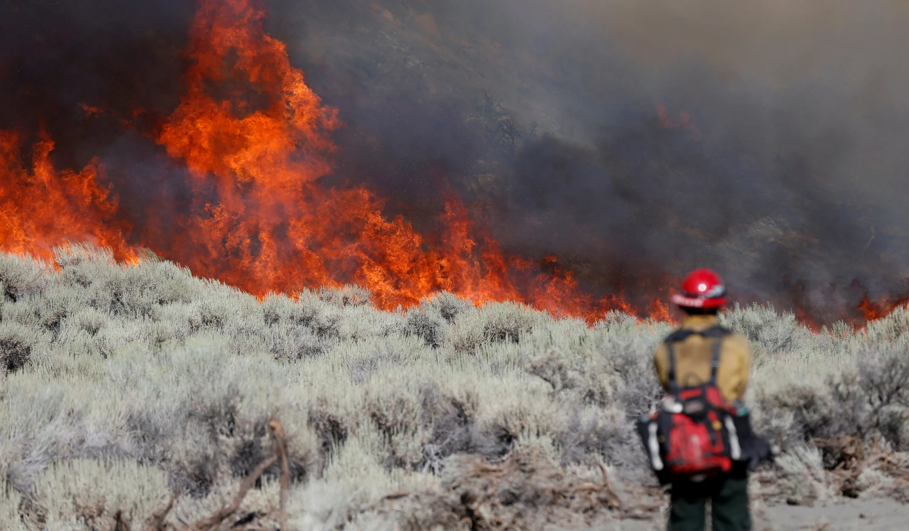 A hot shot crew member waits while battling the Blue Cut fire near Wrightwood, California U.S., August 17, 2016. (Photo by Mario Anzuoni/Reuters)