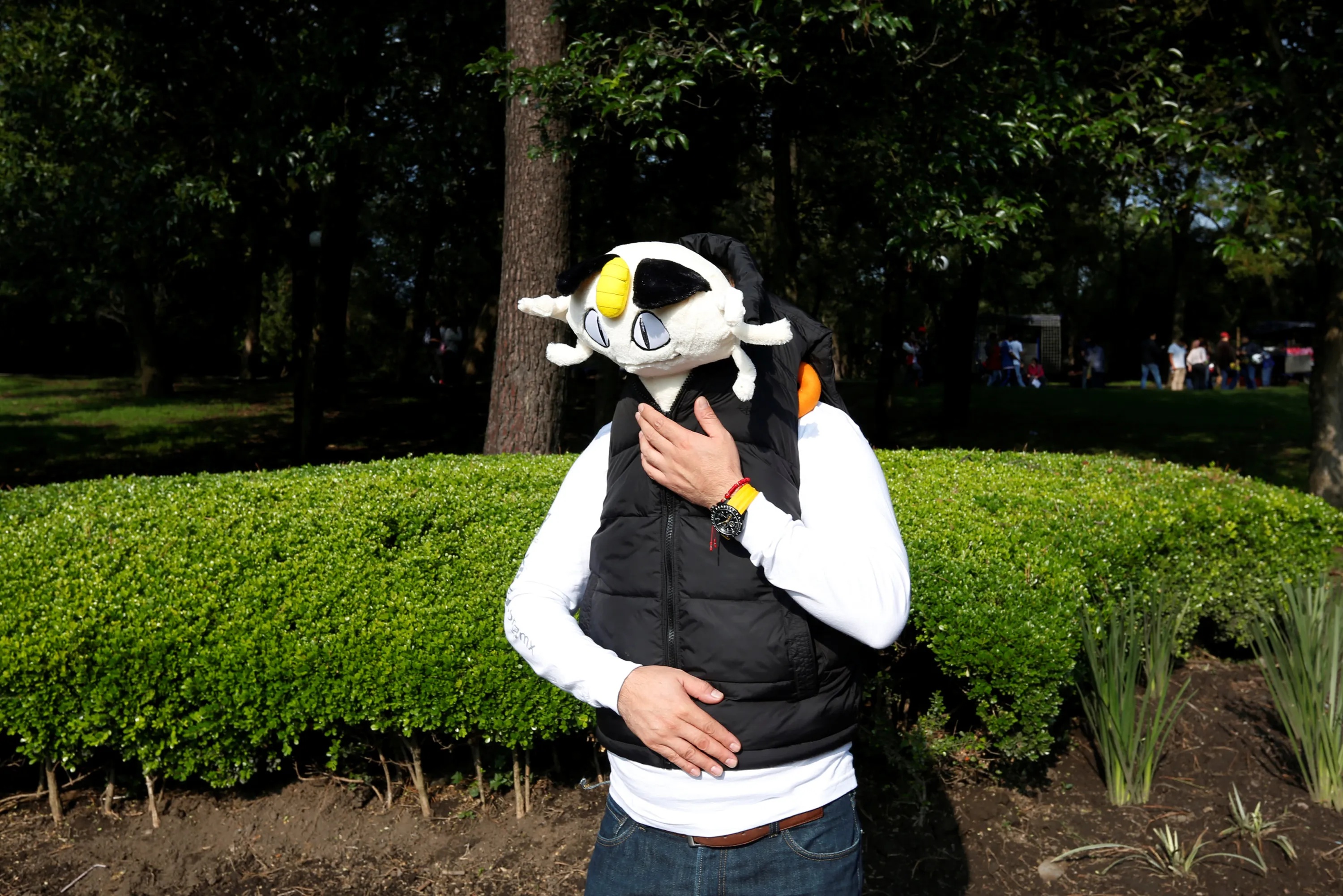 A man covers his face with a stuffed toy of a Pokemon character, Meowth, during a gathering to celebrate “Pokemon Day” at chapultepc park in Mexico City, Mexico August 21, 2016. (Photo by Carlos Jasso/Reuters)
