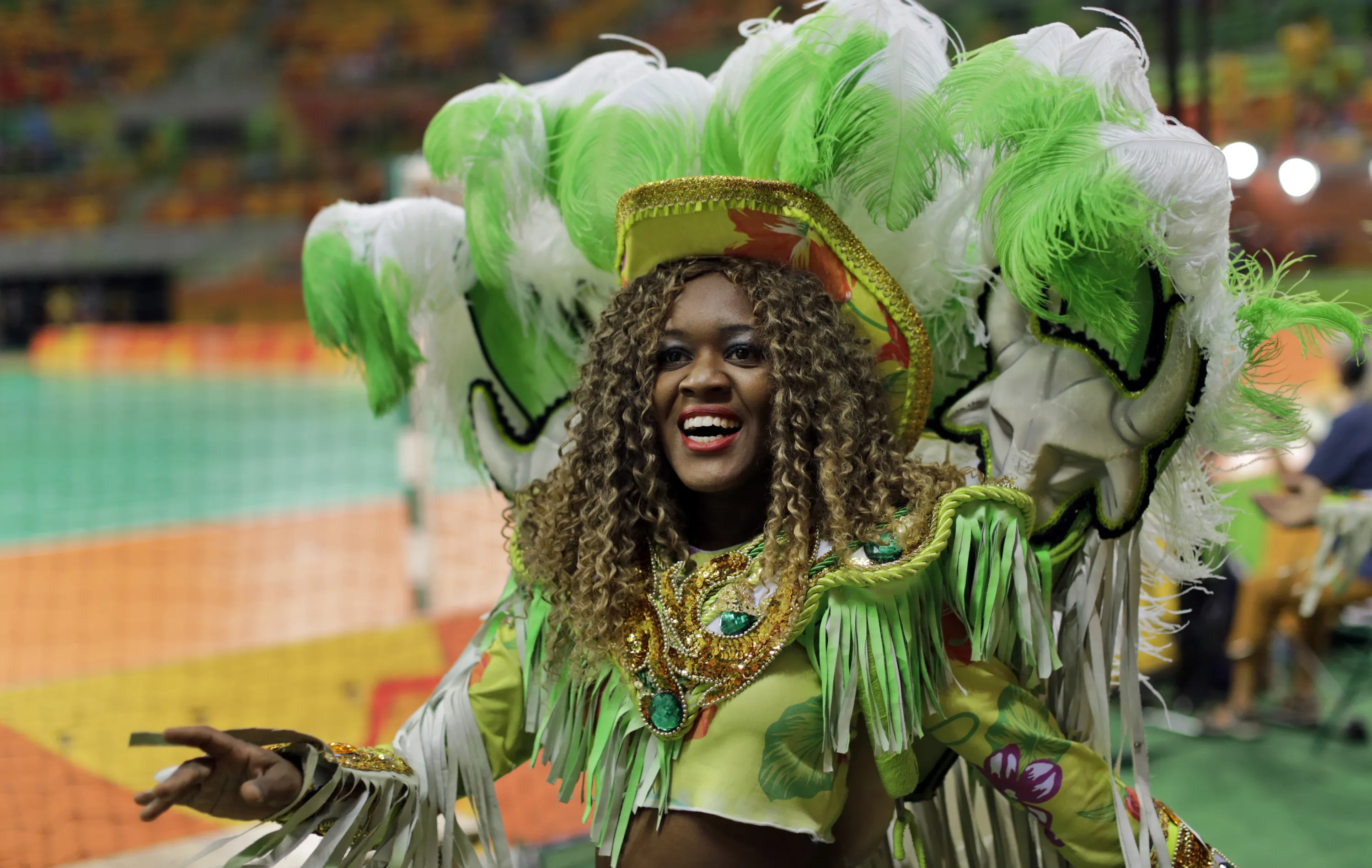 A dancing band parades around the arena before the men's finals handball match between Denmark and France at the 2016 Summer Olympics in Rio de Janeiro, Brazil, Sunday, August 21, 2016. (Photo by Ben Curtis/AP Photo)