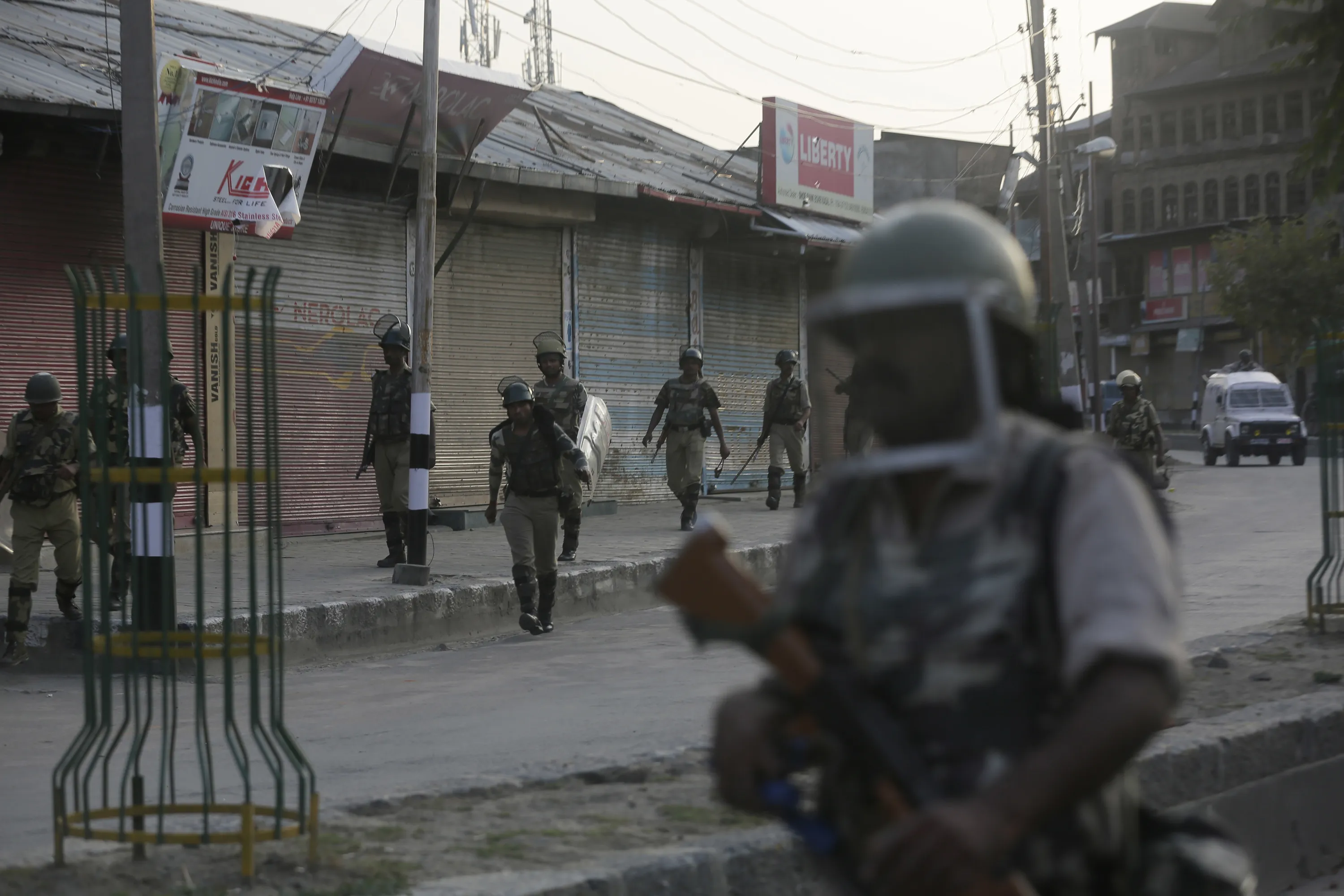Indian paramilitary soldiers walk back towards their camp after a day long curfew in Srinagar, Indian controlled Kashmir, Sunday, August 21, 2016. Security lockdown and protest strikes continued for the 44th straight day Sunday, with tens of thousands of Indian armed police and paramilitary soldiers patrolling the tense region. The killing of a popular rebel commander on July 8 sparked some of Kashmir's largest protests against Indian rule in recent years. (Photo by Mukhtar Khan/AP Photo)