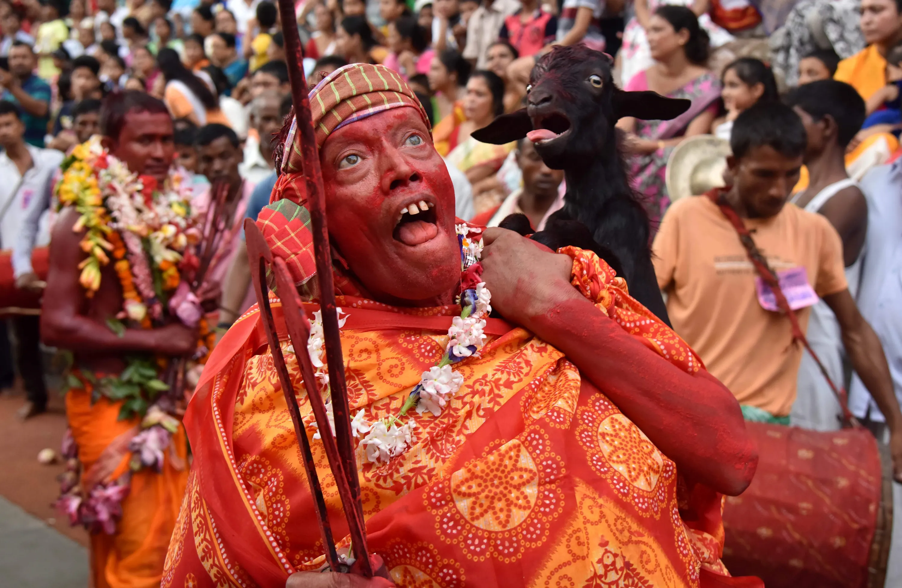 An Indian priest dances as he carries a sacrificial goat during the Deodhani Festival at the Kamakhya Temple in Guwahati, the capital city of the north-eastern state of Assam, on August 18, 2016. The three-day Deodhani festival is held to worship the Serpent Goddess Kamakhya during which goats and pigeons are offered and sacrificed. (Photo by Biju Boro/AFP Photo)