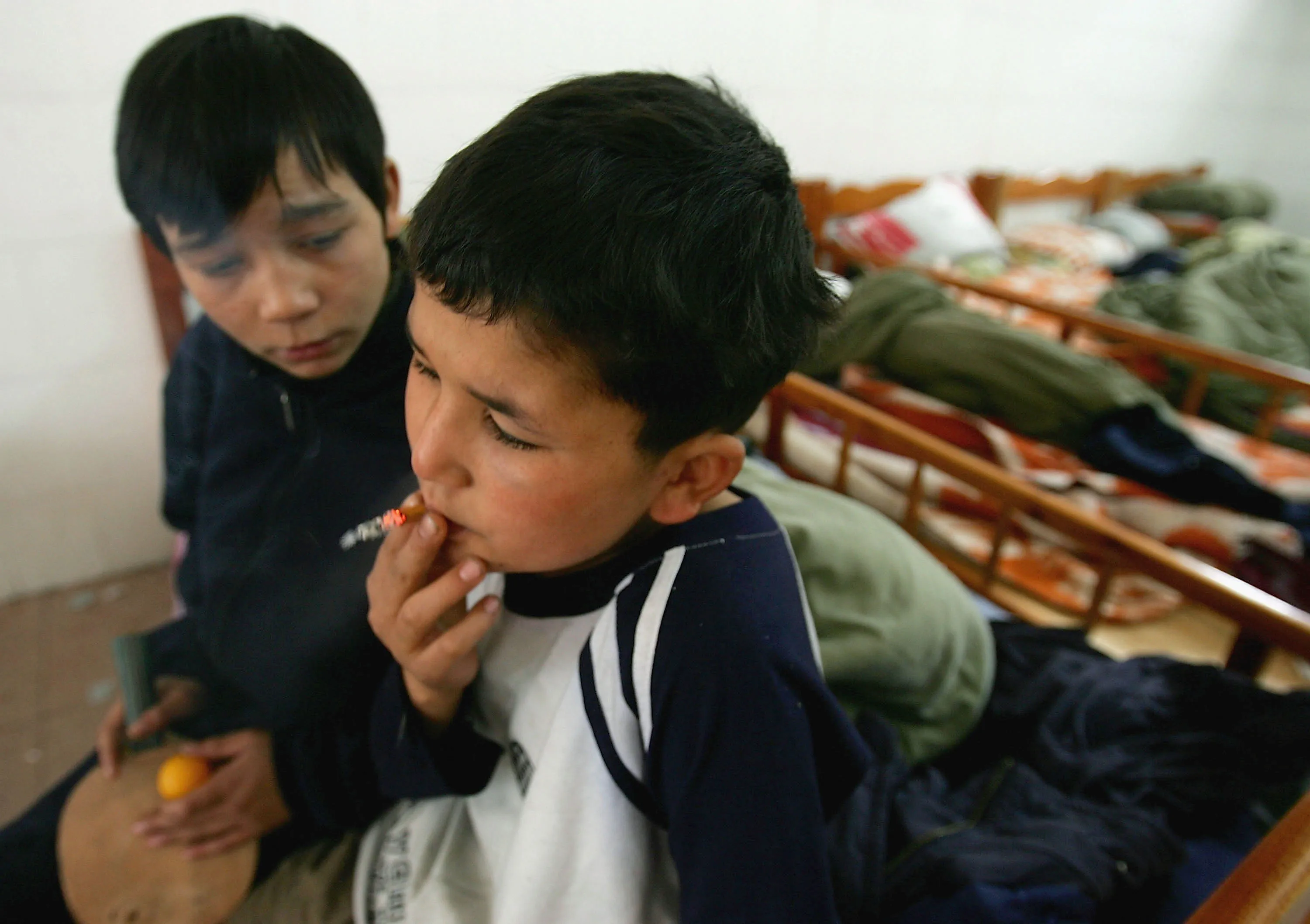 Maimaiti Aili (R), a 13-year old boy from China's Xinjiang Uygur Autonomous Region, smokes at an assistance center February 24, 2005 in Shenzhen, Guangdong Province, China. Aili was kidnapped and taken to Shenzhen by a gang leader and made to steal for him. (Photo by Cancan Chu/Getty Images)