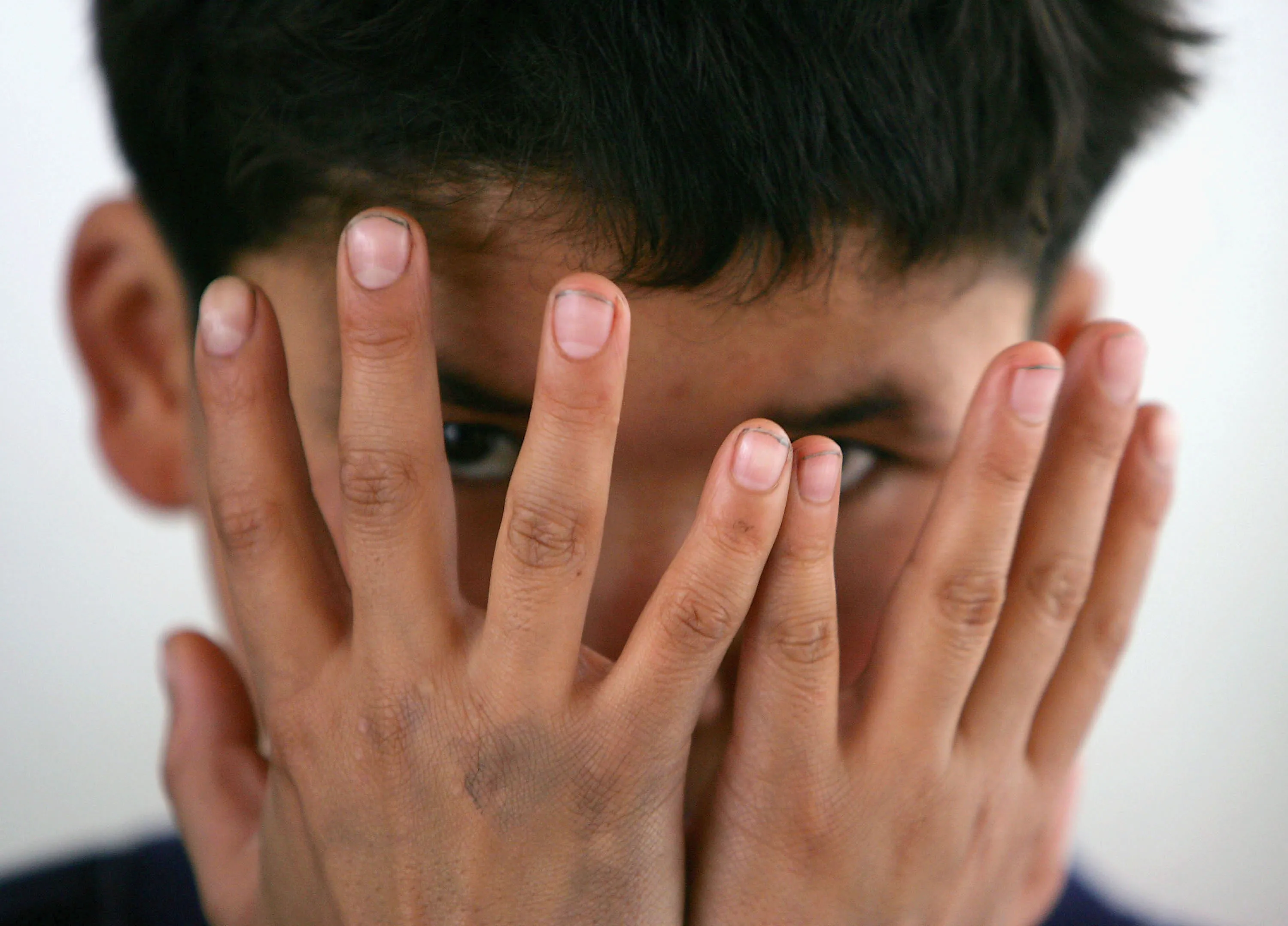 Maimaiti Aili, a 13-year old boy from China's Xinjiang Uygur Autonomous Region, covers his face with his hands at an assistance center February 24, 2005 in Shenzhen, Guangdong Province, China. (Photo by Cancan Chu/Getty Images)