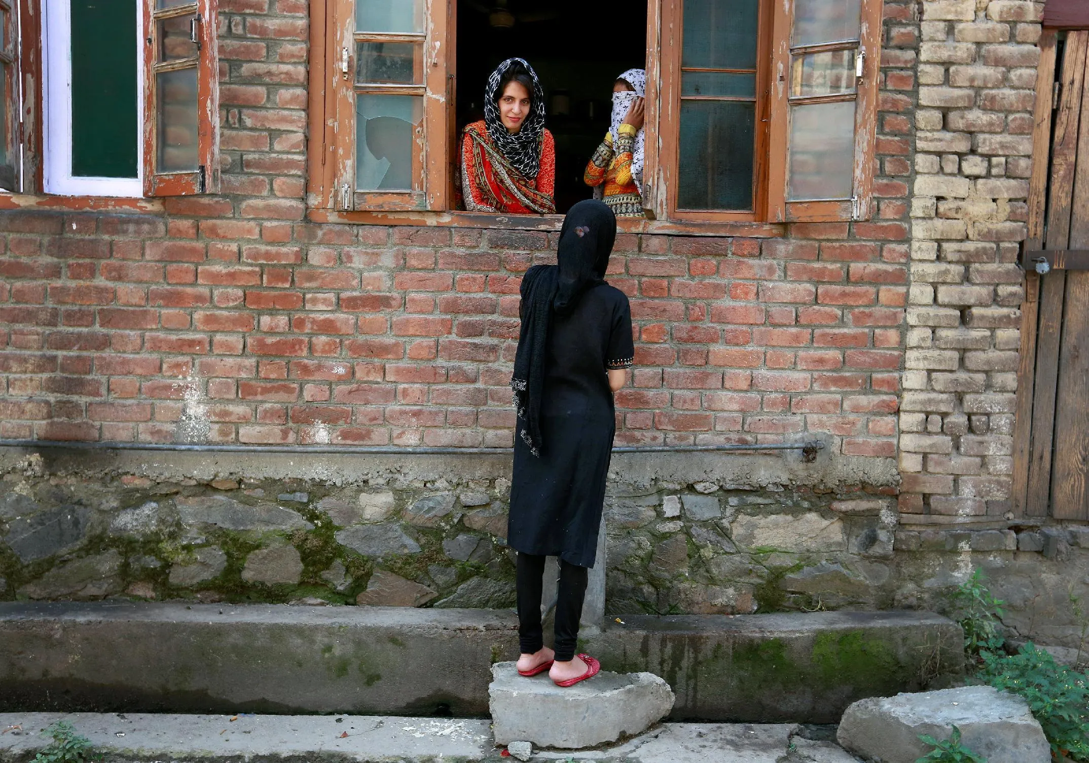 A woman stands on rubble to talk to her friends after a night of clashes between protesters and security forces in Srinagar as the city remains under curfew following weeks of violence in Kashmir, August 21, 2016. (Photo by Cathal McNaughton/Reuters)