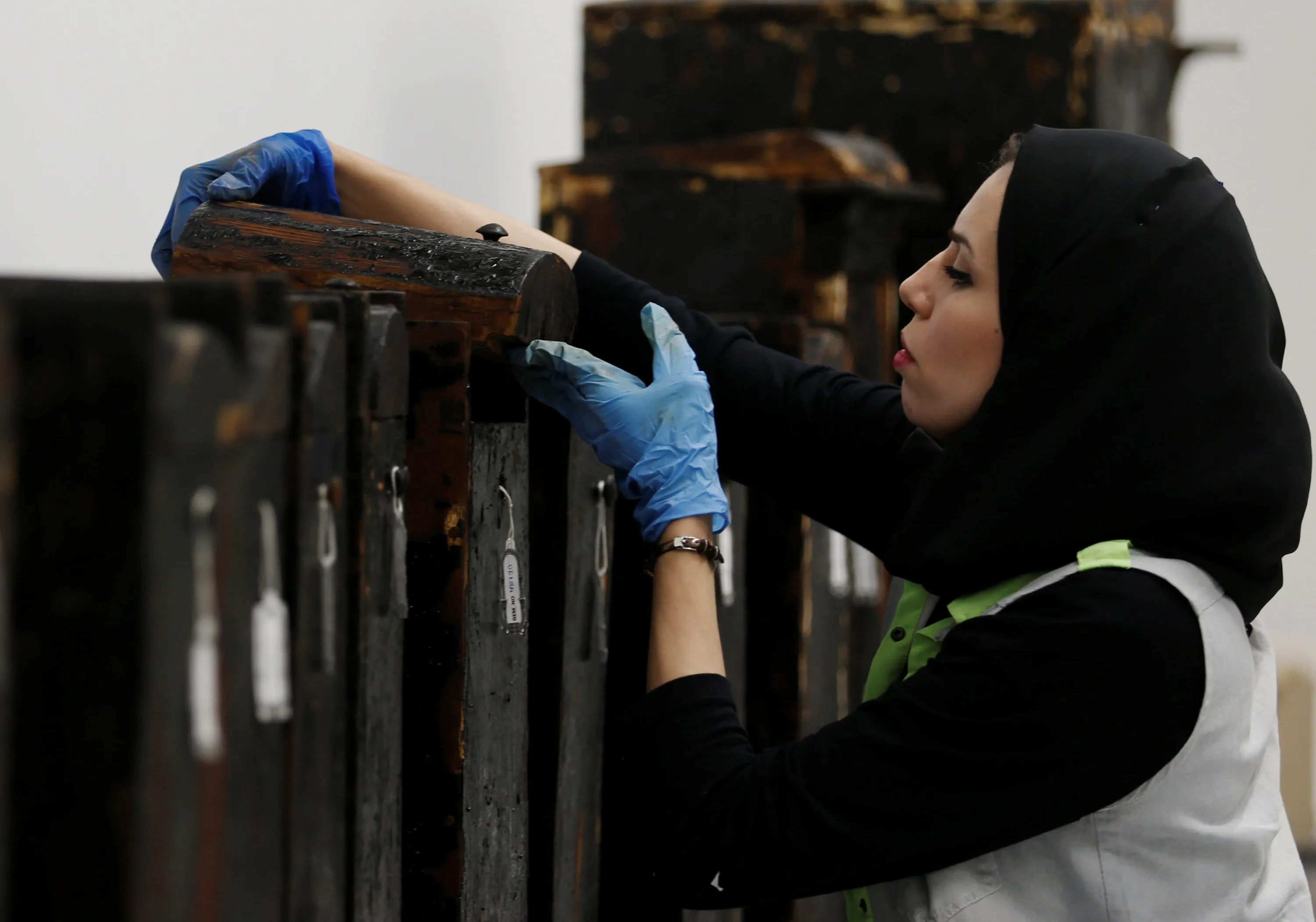 An Egyptian archeological technician works with the remains of pharaoh King Tutankhamun in the Wood Laboratory of the conservation centre of the Grand Egyptian Museum, under construction, on the outskirts of Cairo, Egypt August 21, 2016. (Photo by Amr Abdallah Dalsh/Reuters)