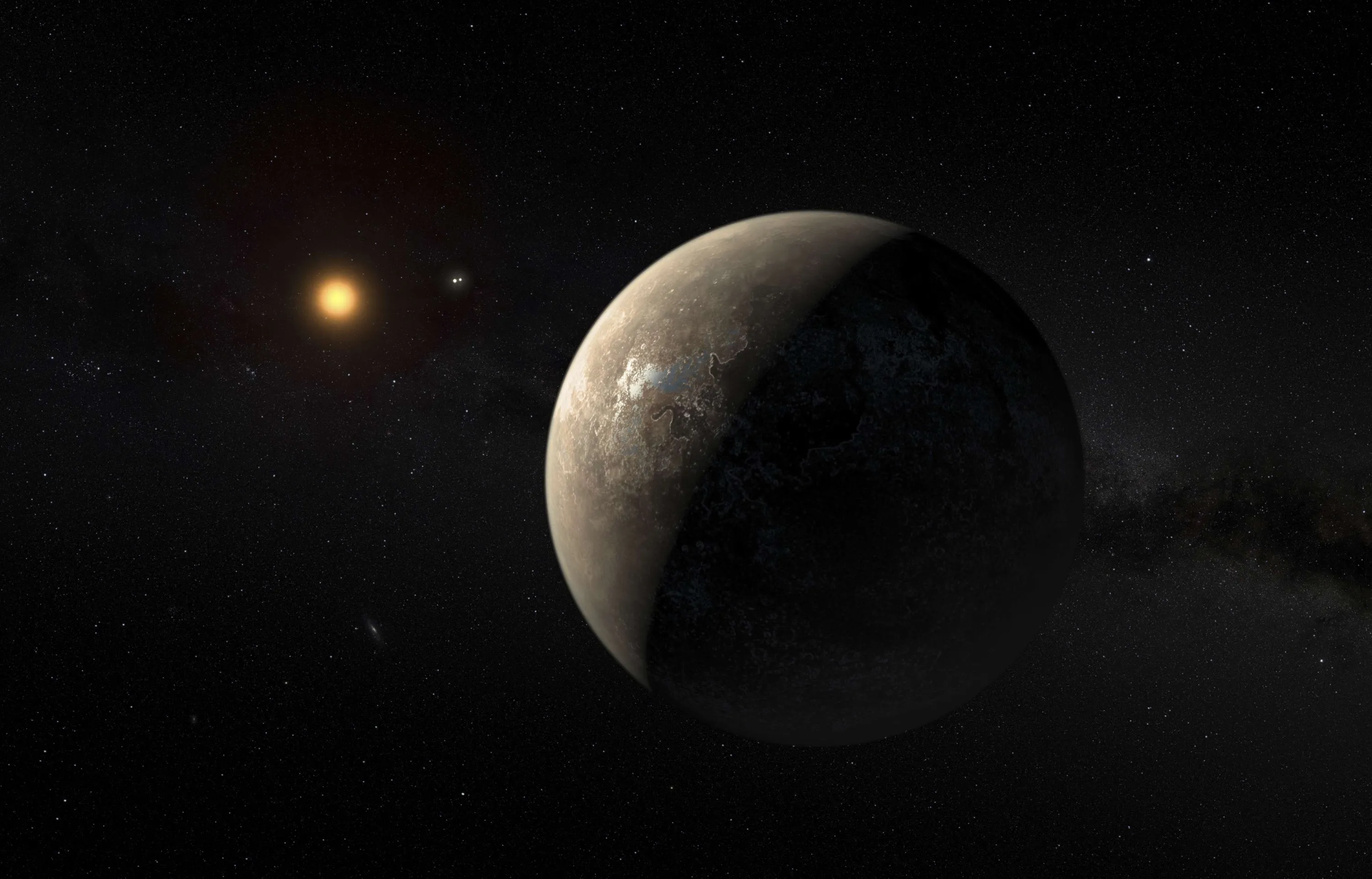 The planet Proxima b orbiting the red dwarf star Proxima Centauri, the closest star to our Solar System, is seen in an undated artist's impression released by the European Southern Observatory August 24, 2016. (Photo by M. Kornmesser/Reuters/ESO)