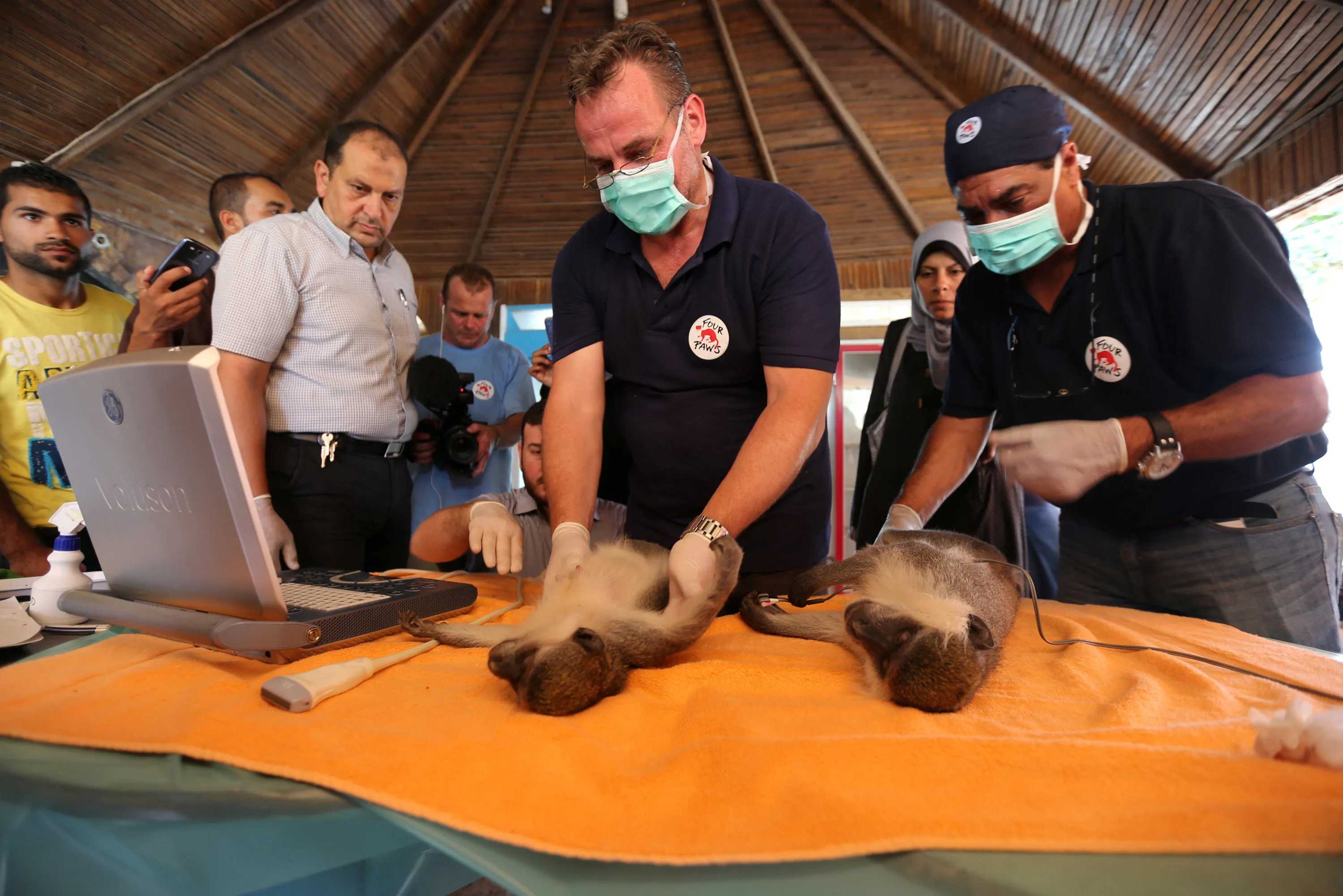 Members of Four Paws International team examine monkeys before they are taken out of Gaza, at a zoo in Khan Younis in the southern Gaza Strip August 23, 2016. (Photo by Ibraheem Abu Mustafa/Reuters)