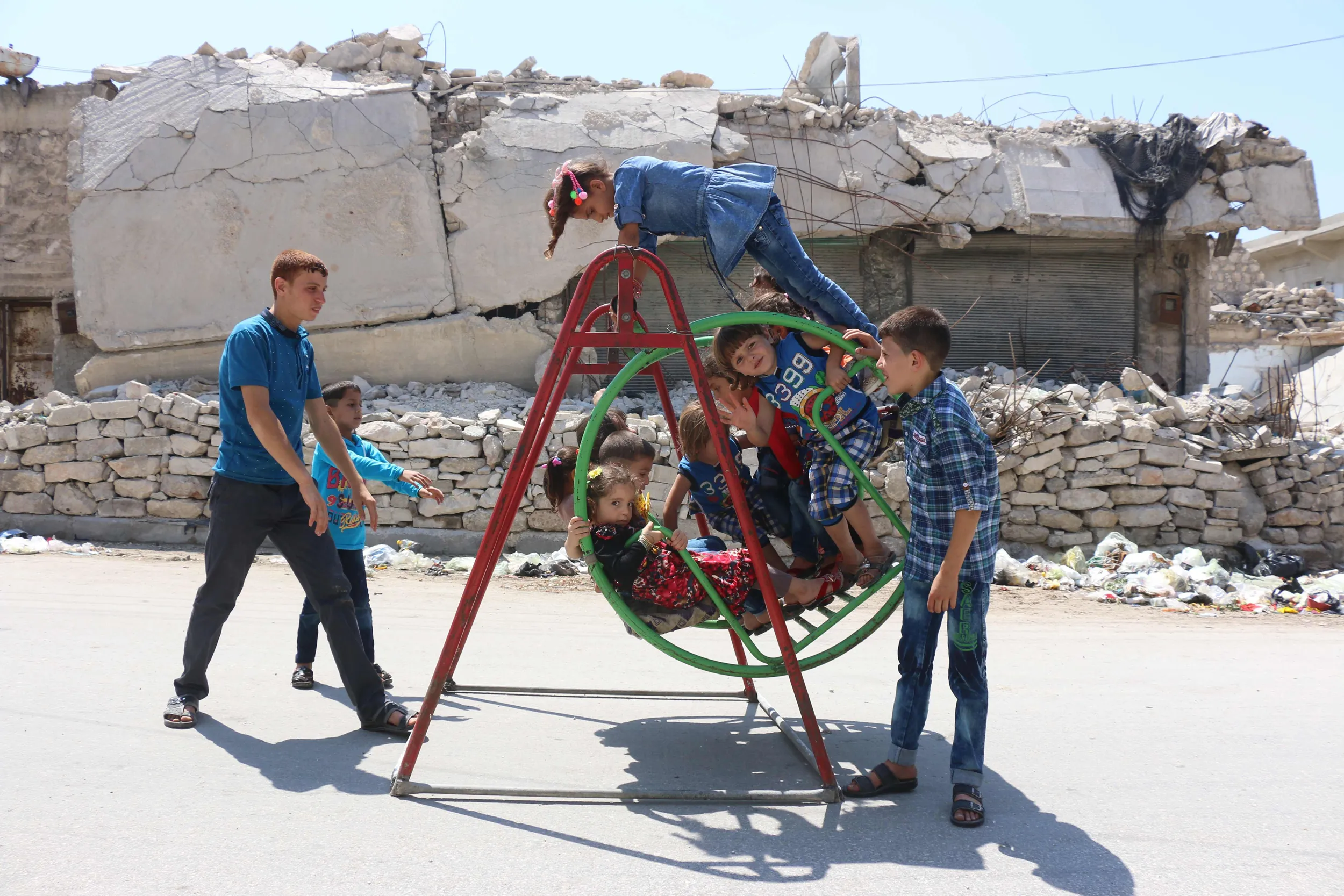 Syrian children play on a swing in front of a damaged building in rebel-held side of Aleppo on July 6, 2016, during celebrations for Eid al-Fitr, which marks the end of the Muslim holy fasting month of Ramadan. (Photo by Thaer Mohammed/AFP Photo)