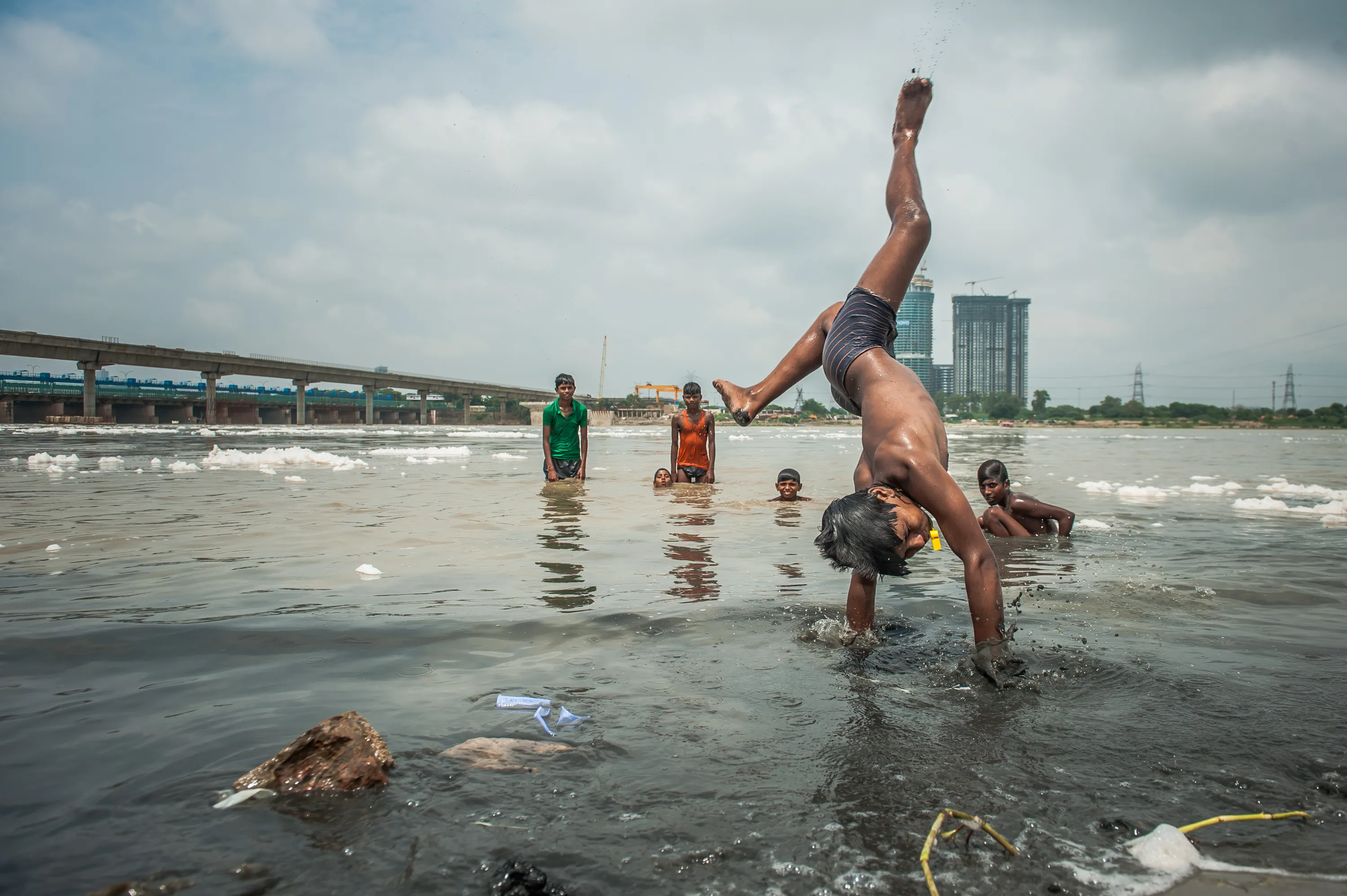 A boy performs a handstand while swimming in the polluted river Yamuna in New Delhi, India on August 2, 2016. The river is said to be the most polluted in the country. (Photo by Shams Qari/Barcroft Images)