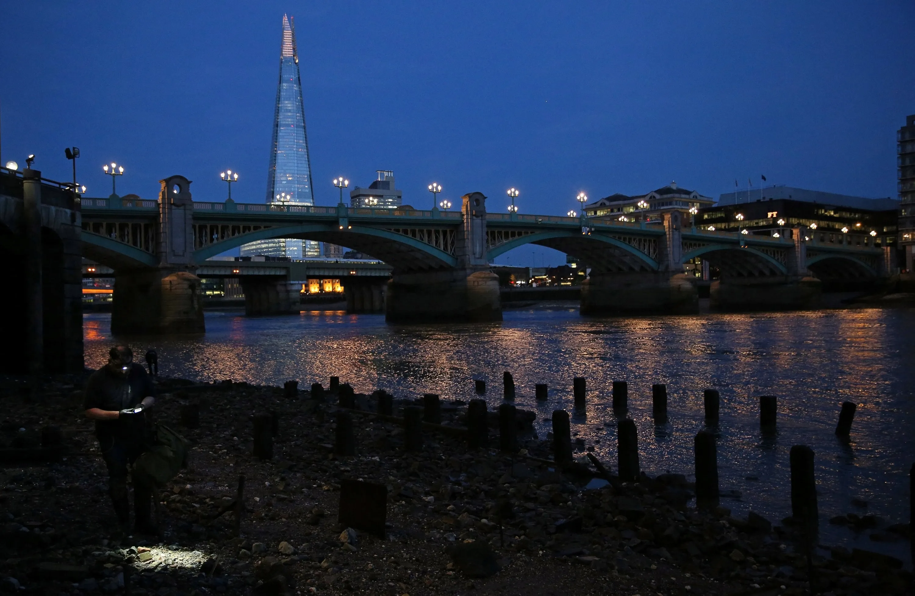 A mudlark uses a head torch to look for objects on the bank of the River Thames in London, Britain June 06, 2016. (Photo by Neil Hall/Reuters)