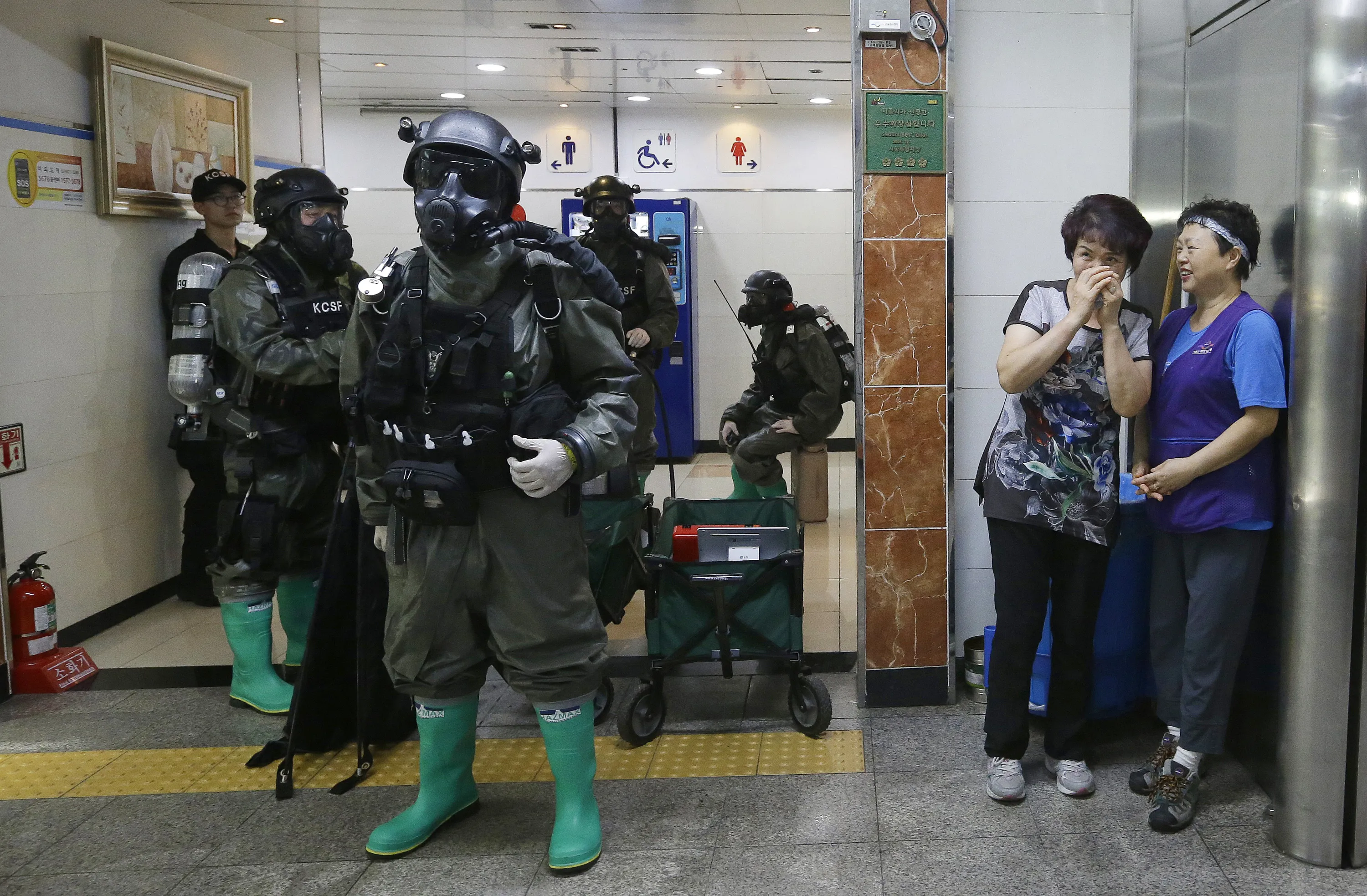 South Korean army soldiers stand as women watch during an anti-terror drill as part of the Ulchi Freedom Guardian exercise, at Yoido Subway Station in Seoul, South Korea, Tuesday, August 23, 2016. South Korea and the United States began annual military drills Monday despite North Korea's threat of nuclear strikes in response to the exercises that it calls an invasion rehearsal. (Photo by Ahn Young-joon/AP Photo)