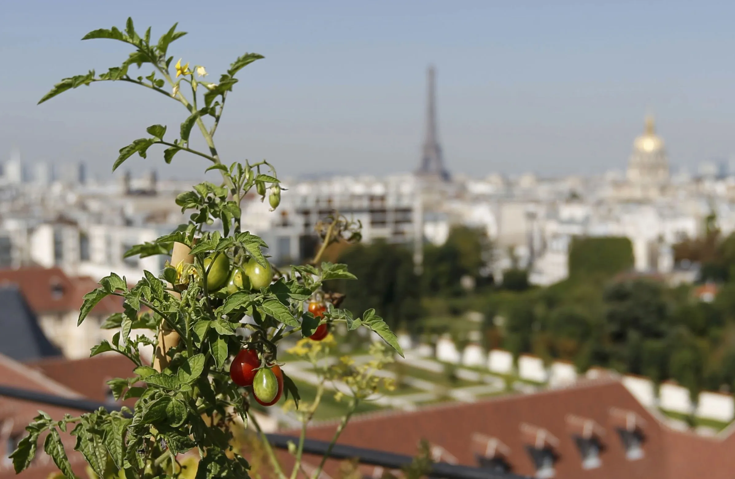 A tomato plant is seen in a planter box on the 700 square metre (7500 square feet) rooftop of the Bon Marche, where the store's employees grow some 60 kinds of fruits and vegetables such as strawberries, zucchinis, mint and other herbs in their urban garden with a view of the capital in Paris, France, August 26, 2016. (Photo by Regis Duvignau/Reuters)