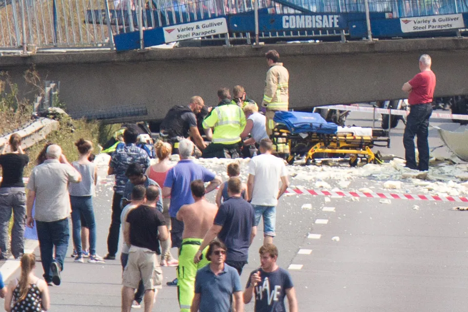 A footbridge collapses onto motorway traffic on the M20 in Kent this afternoon. It is believed a digger struck the bridge causing it to fall onto a lorry and other traffic. Air ambulance now on the scene. Featuring: m20, kent, bridge, collapse Where: Near Maidstone, United Kingdom When: 27 Aug 2016 Credit: WENN.com