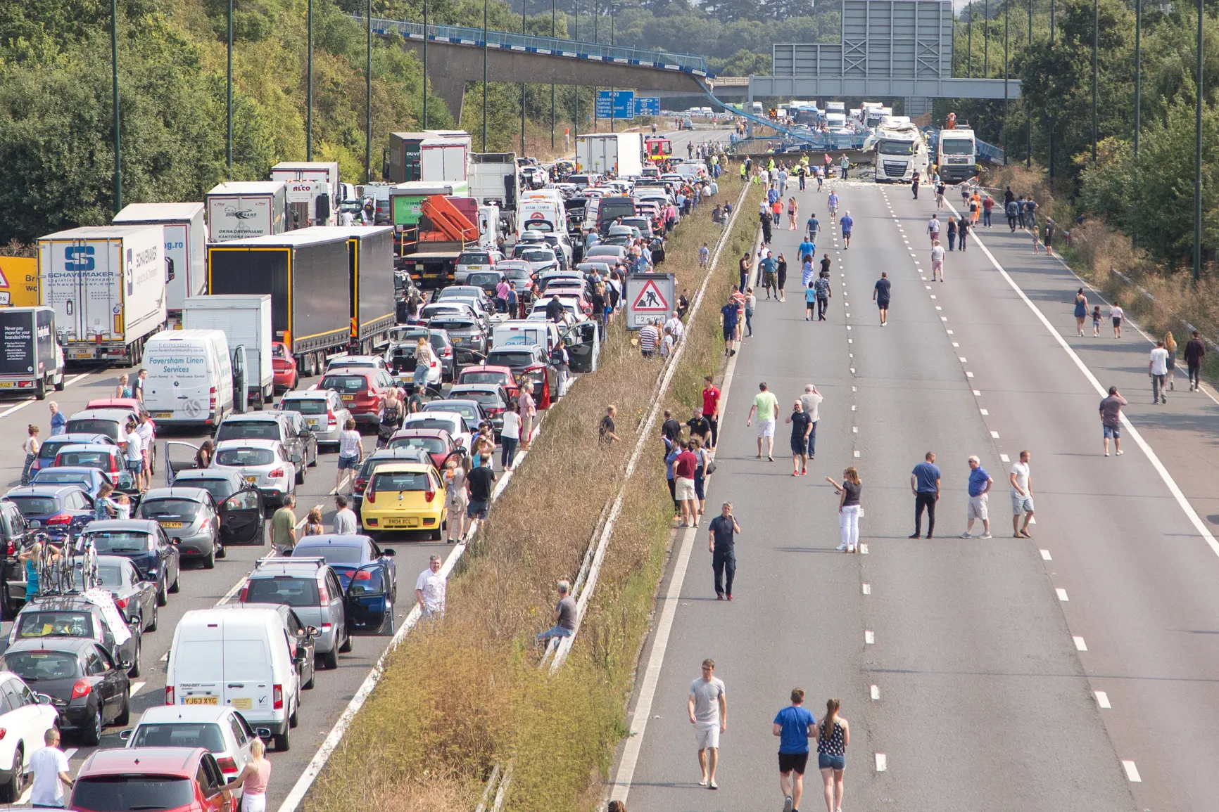A footbridge collapses onto motorway traffic on the M20 in Kent this afternoon. It is believed a digger struck the bridge causing it to fall onto a lorry and other traffic. Air ambulance now on the scene. Featuring: m20, kent, bridge, collapse Where: Near Maidstone, United Kingdom When: 27 Aug 2016 Credit: WENN.com