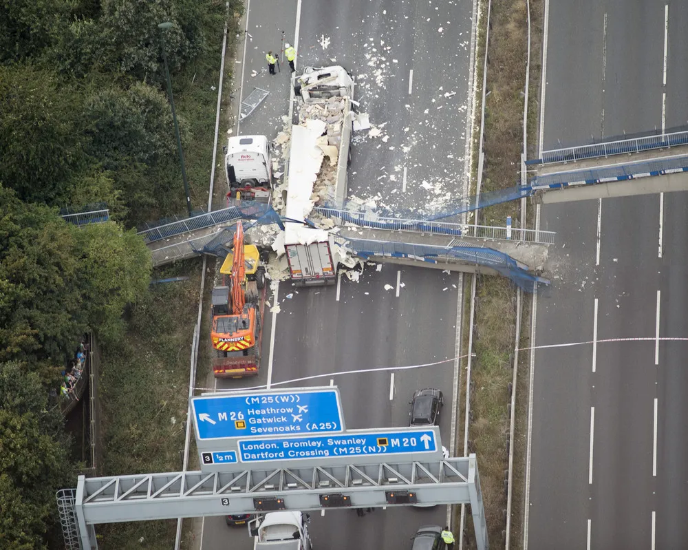The footbridge over the M20 in Kent that collapsed onto two lorries and a motorcycle this afternoon - PICTURE BY JOHN McLELLAN - 27.8.16