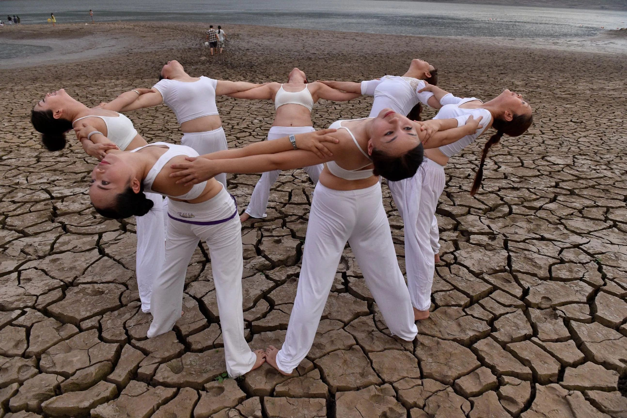 Women perform yoga on a dried river bank in Yunyang county, Chongqing Municipality, August 21, 2016. (Photo by Reuters/China Daily)