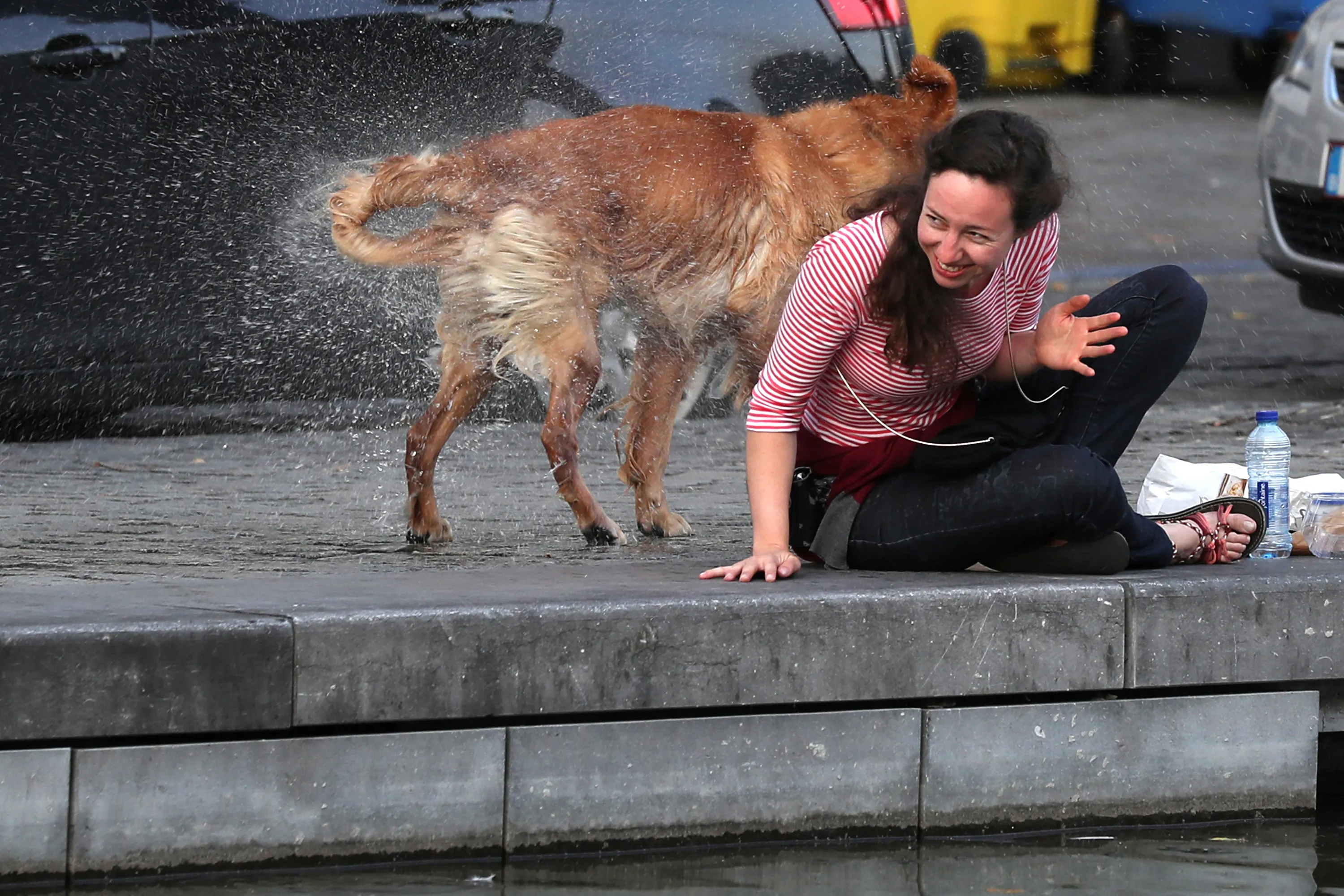 A woman is caught unexpectedly by a dog shaking off water after emerging from a canal in Brussels, Belgium August 17, 2016. (Photo by Clodagh Kilcoyne/Reuters)