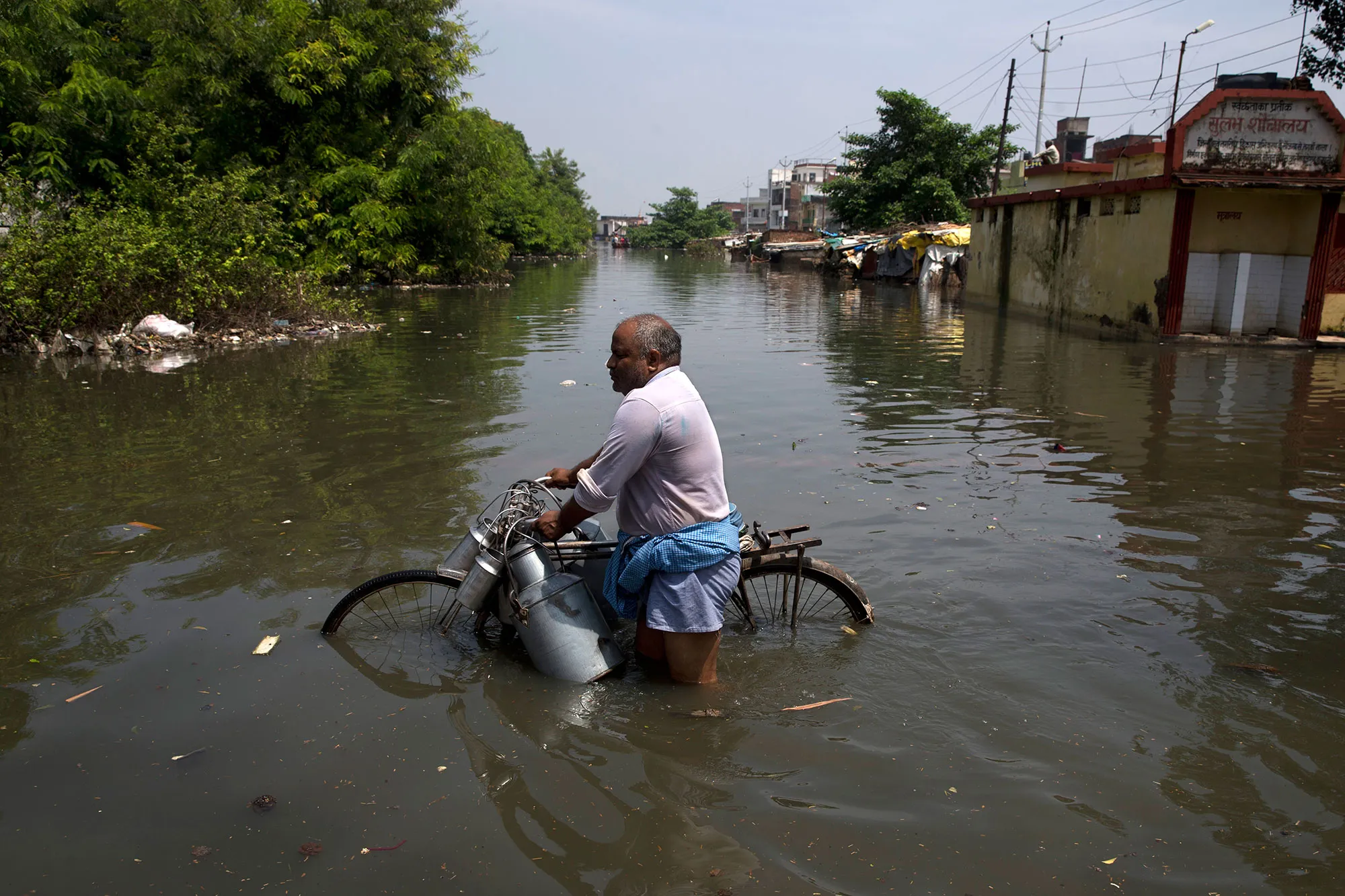An Indian milkman wades through flooded water with his bicycle in Varanasi, India, Friday, August 26, 2016. Misery eased somewhat, with rains ebbing over the past three days in Uttar Pradesh state, where 200,000 people had moved to relief centers after their homes were submerged, said Deepak Singhal, a state official. (Photo by Tsering Topgyal/AP Photo)