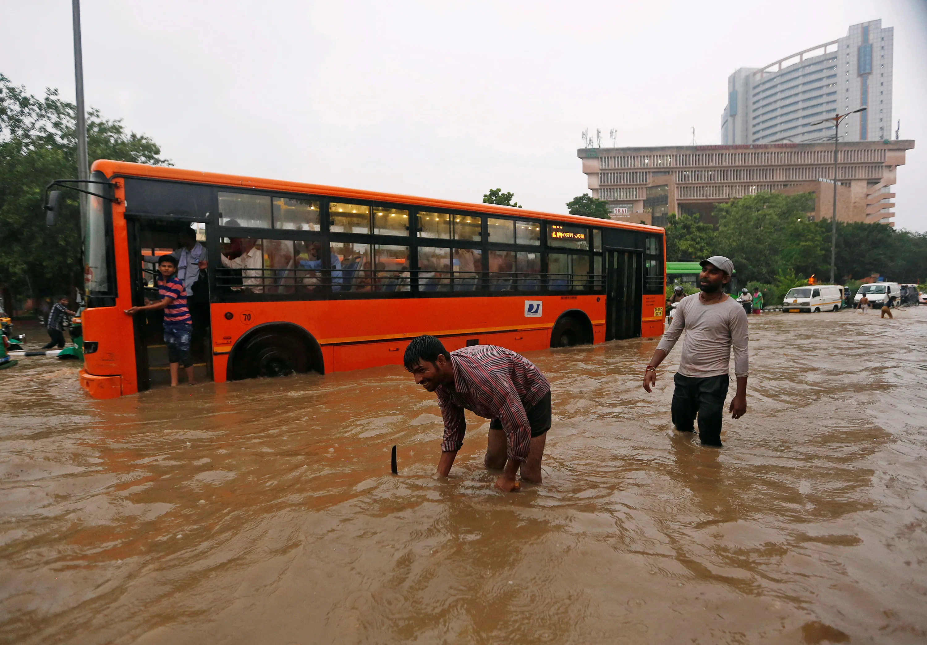 A municipal worker uncovers a manhole on a flooded street during heavy rains in New Delhi, India, August 29, 2016. (Photo by Adnan Abidi/Reuters)