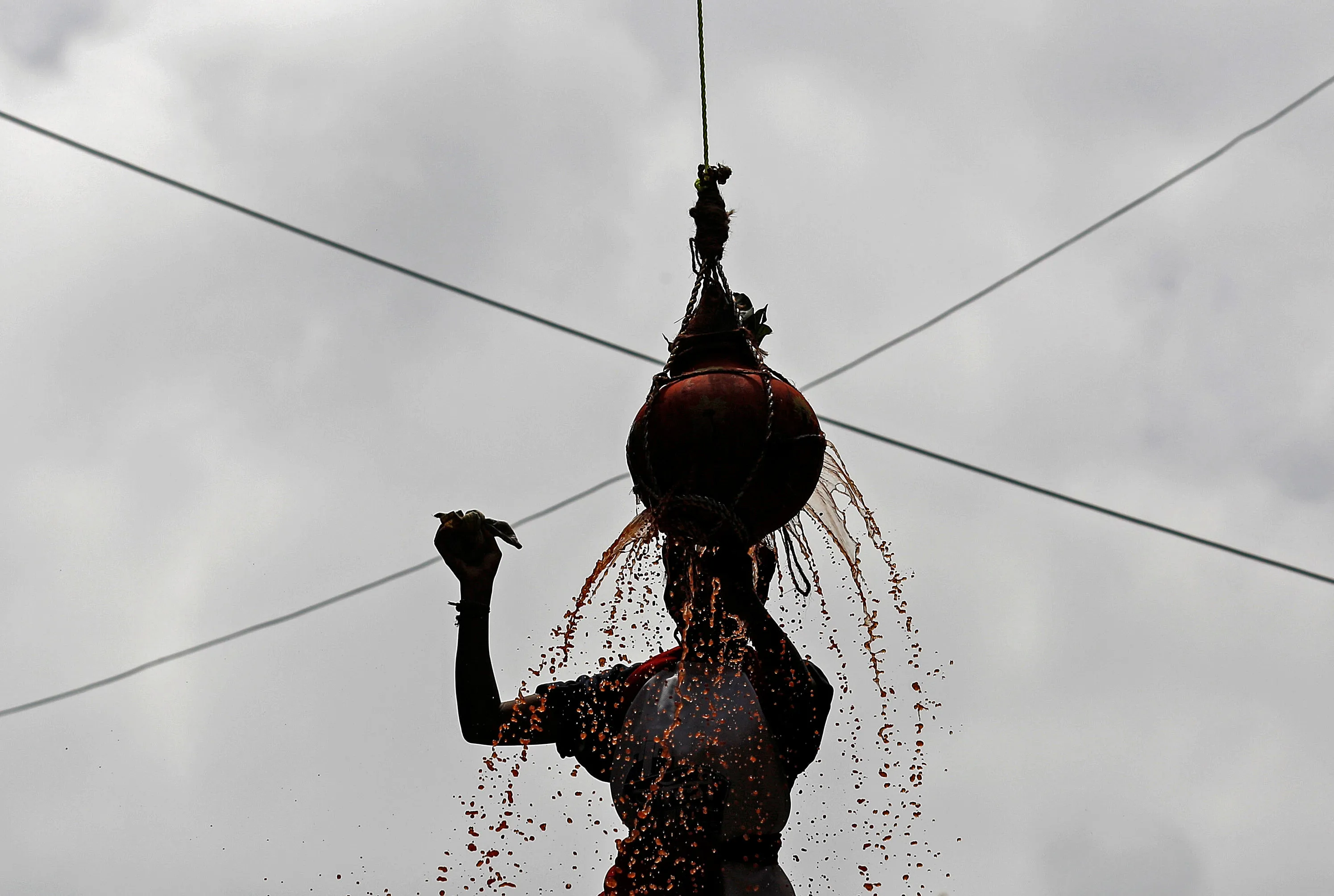 A devotee breaks a clay pot containing curd during celebrations to mark the Hindu festival of Janmashtami in Mumbai, India August 25, 2016. (Photo by Danish Siddiqui/Reuters)
