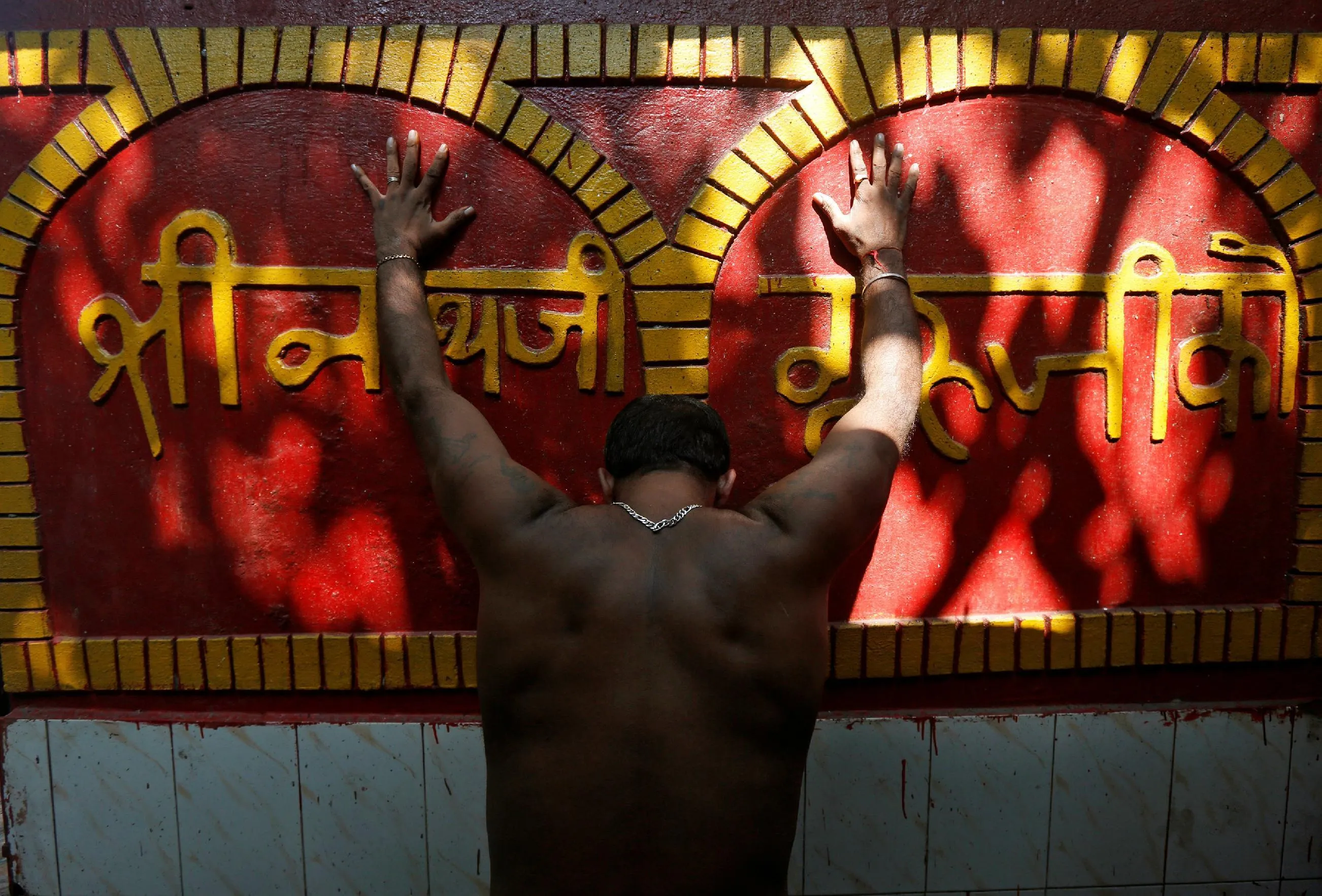 A Hindu man touches a wall of a temple as he offers prayers after taking a dip in the river Ganges in Kolkata, India, August 25, 2016. (Photo by Rupak De Chowdhuri/Reuters)