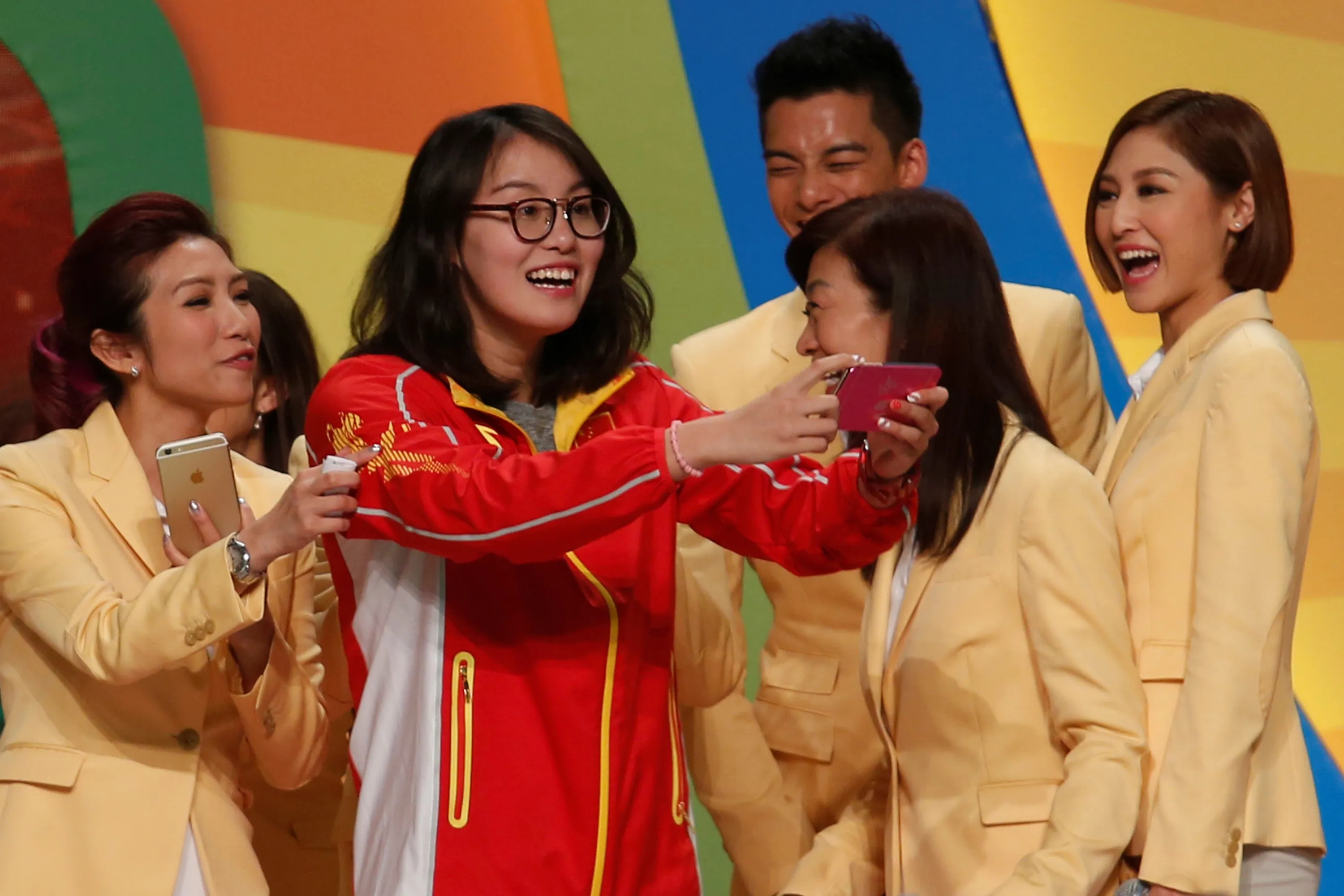 Chinese swimmer Fu Yuanhui takes a selfie with television presenters during an entertainment show by Chinese Rio Olympics medalists in Hong Kong, China August 28, 2016. (Photo by Bobby Yip/Reuters)