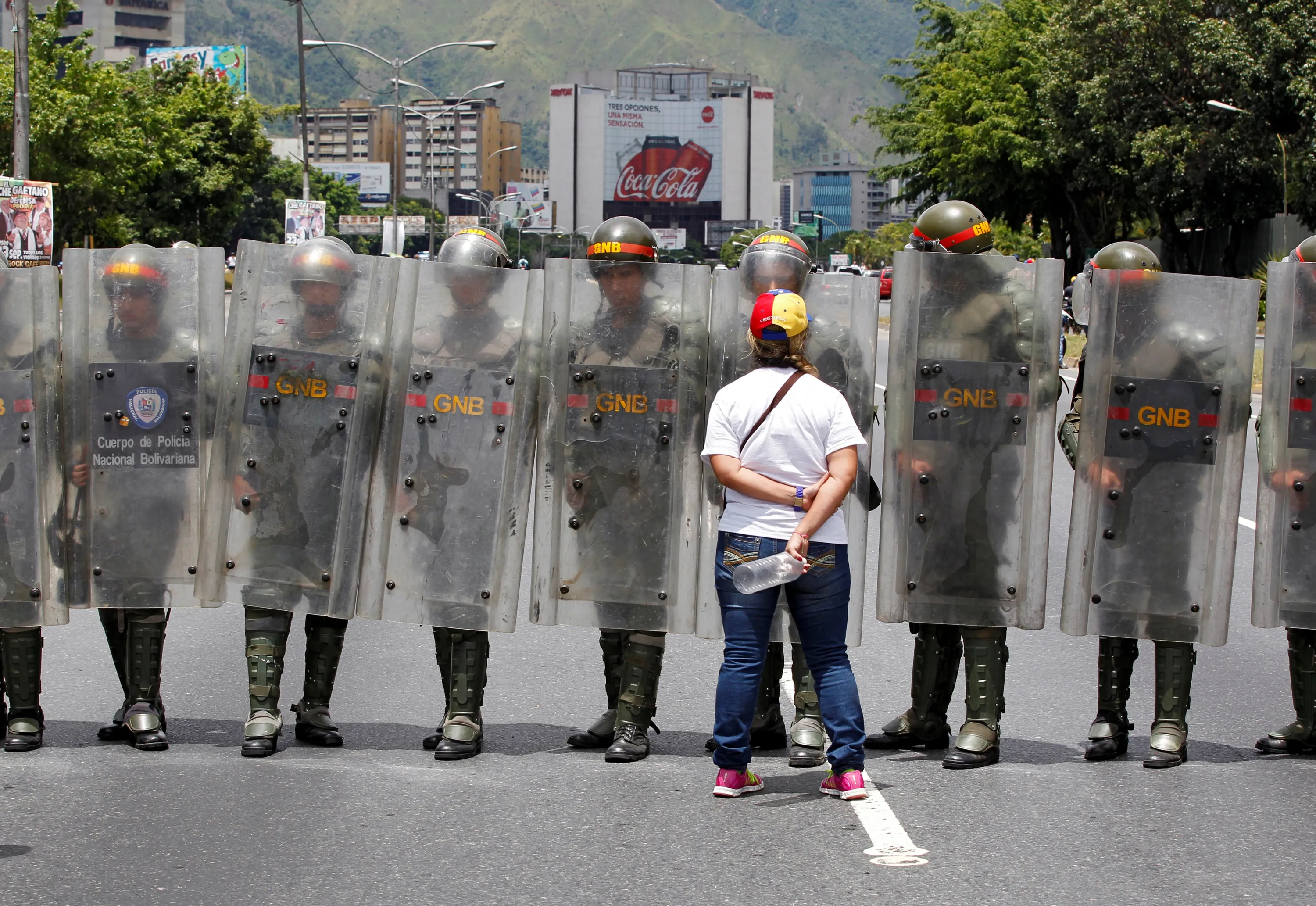 A woman looks on as police officers block the street while opposition supporters take part in a rally to demand a referendum to remove Venezuela's President Nicolas Maduro, in Caracas, Venezuela, September 1, 2016. (Photo by Christian Veron/Reuters)