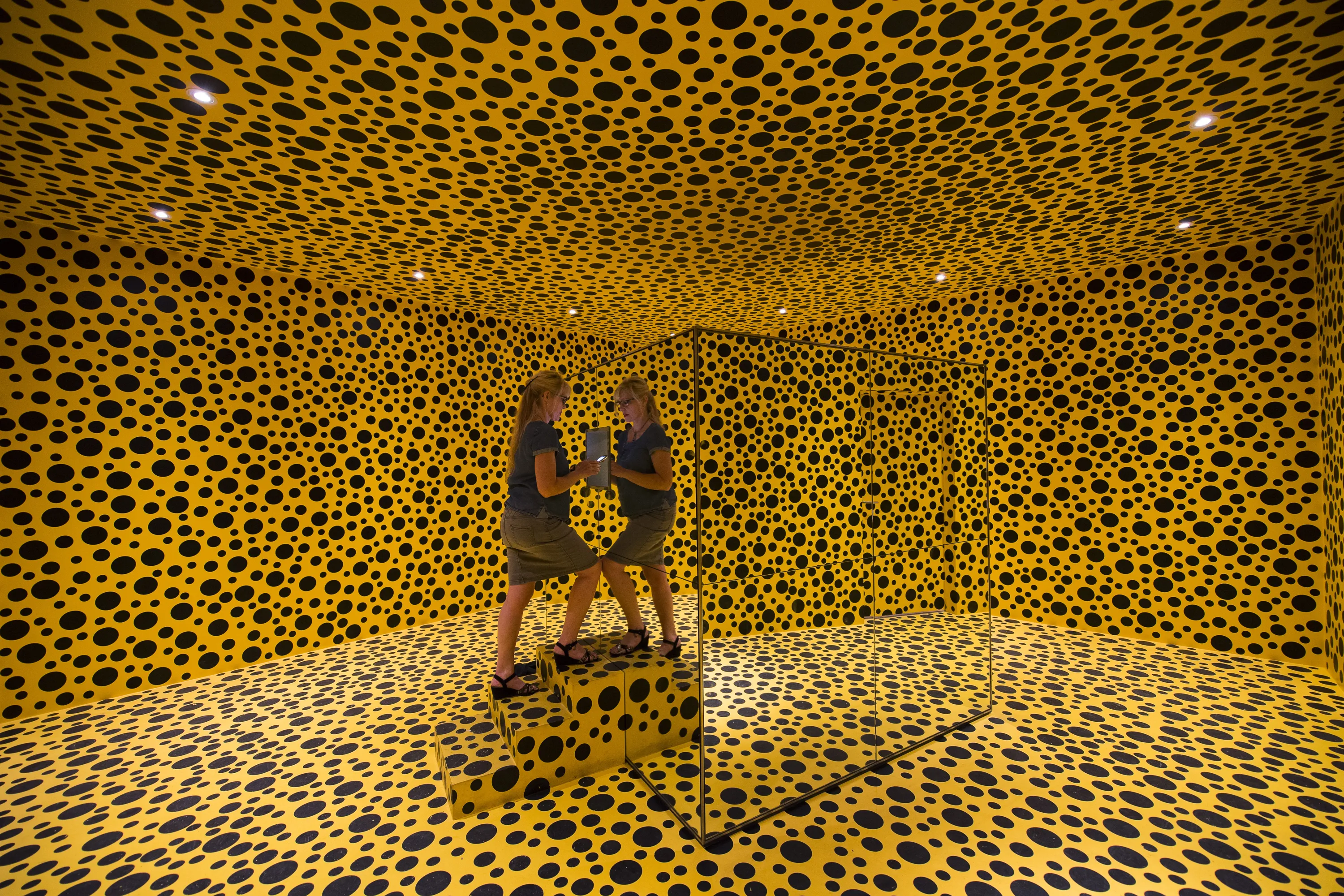 A visitor checks an art installation entitled “Mirror Room (Pumpkin)”, 1991, by Japanese artist Yayoi Kusama, part of the In Infinity art exhibition presented at the Moderna Museet, the Museum of Modern Art on August 31, 2016 in Stockholm. (Photo by Jonathan Nackstrand/AFP Photo)
