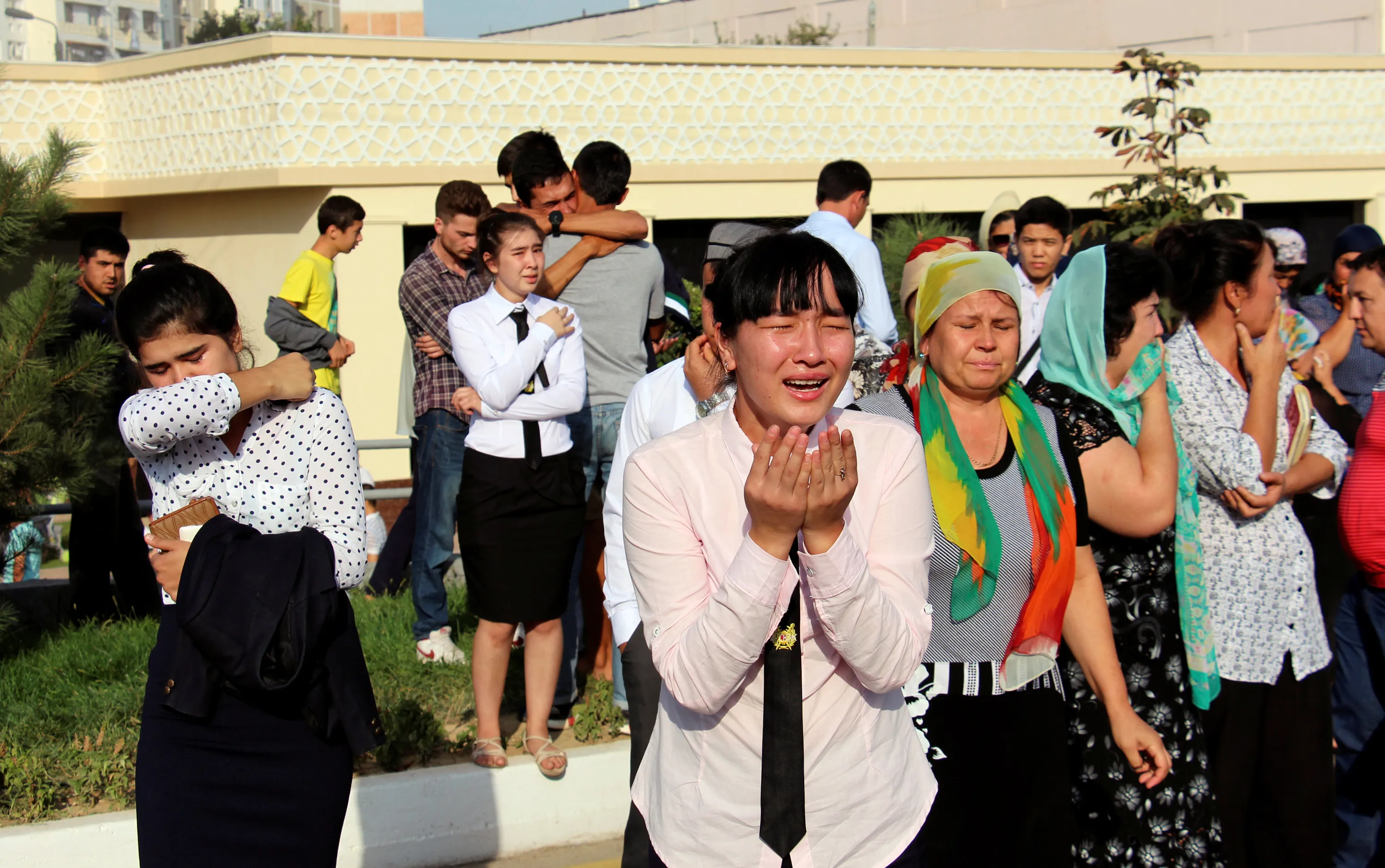 People react as they gather to meet a mourning motorcade and to pay the tribute to the memory of Uzbek late President Islam Karimov in Tashkent, Uzbekistan, September 3, 2016. (Photo by Muhammadsharif Mamatkulov/Reuters)