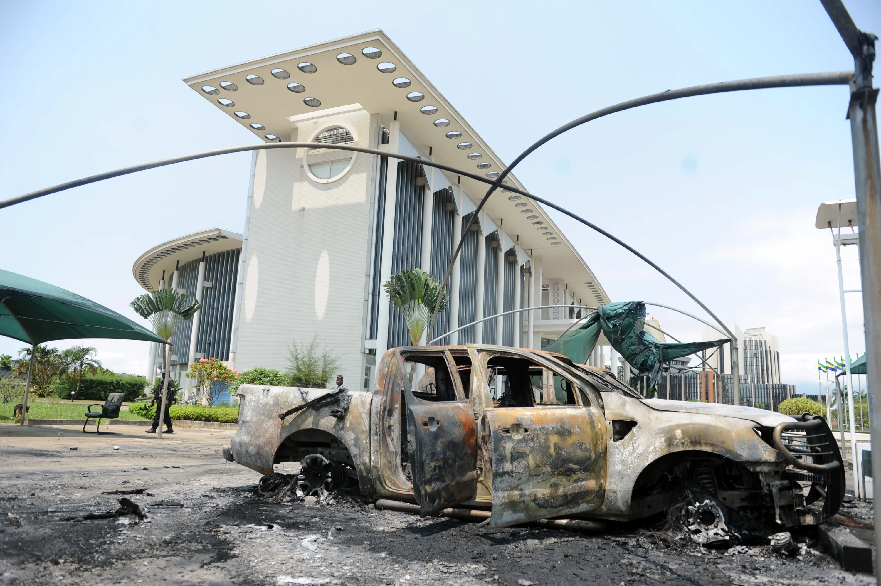 Burnt out cars are seen outside a government building, following an election protest in Libreville, Gabon, Thursday September 1, 2016. Gabon's newly re-elected president sought to assert authority Thursday as the presidential guard attacked the opposition candidate's party headquarters overnight, killing at least one person and injuring more than a dozen amid fiery protests that have seen hundreds detained and the internet blocked. (Photo by Joel Bouopda/AP Photo)