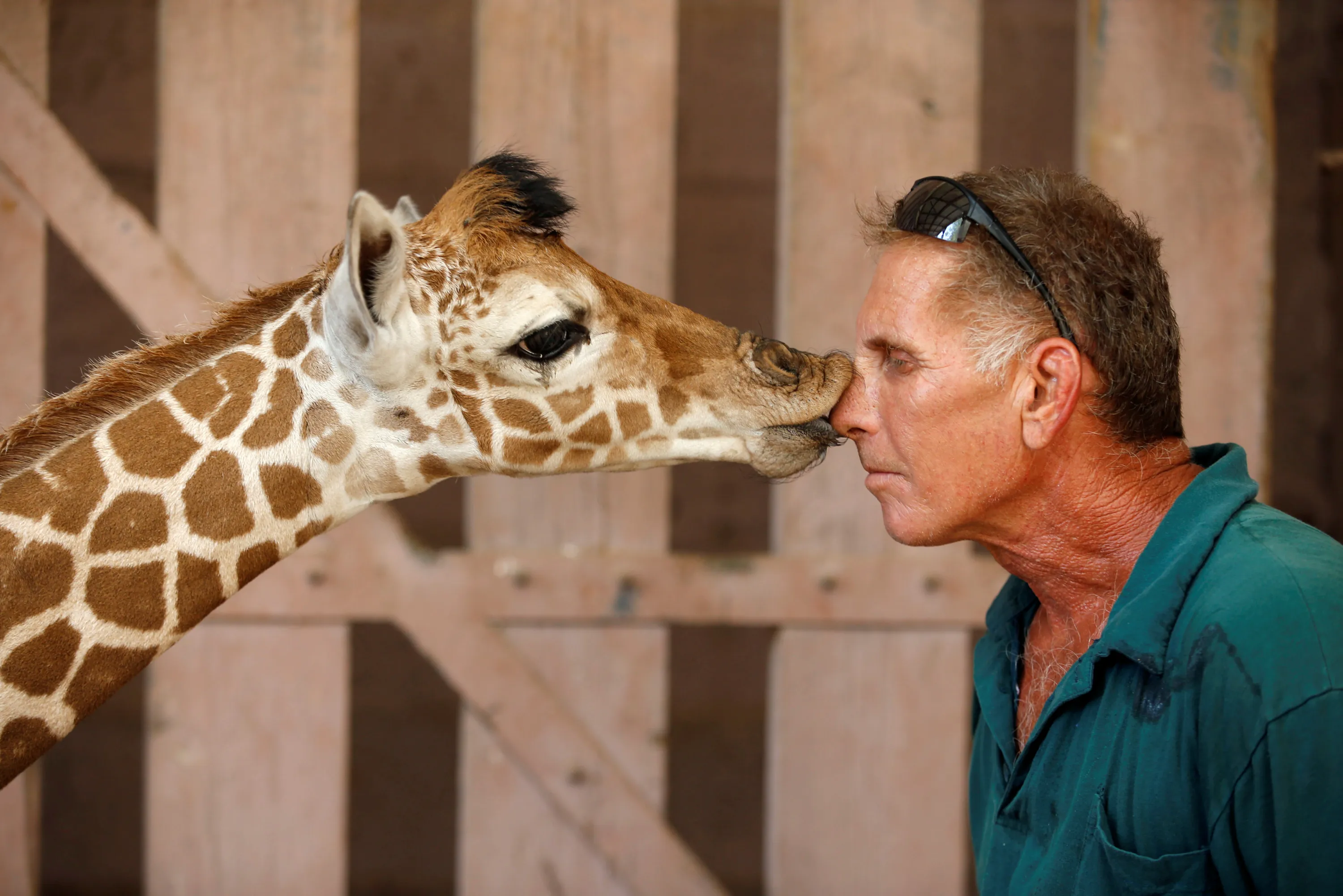 Safari keeper Guy Pear gets a kiss from a five-day-old reticulated giraffe, at an enclosure at the Safari Zoo in Ramat Gan, near Tel Aviv, Israel August 30, 2016. (Photo by Baz Ratner/Reuters)