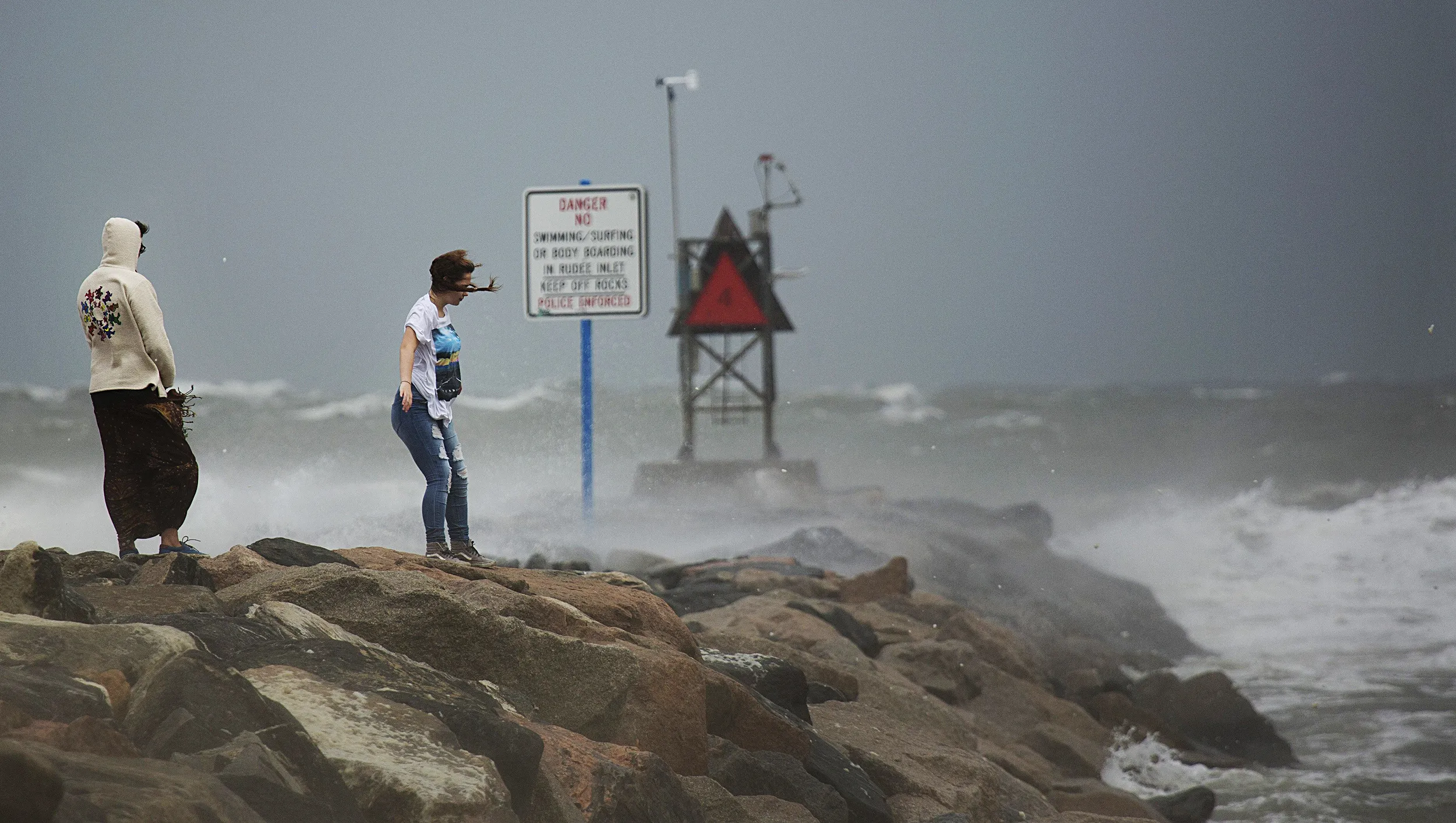 Near to a warning sign to keep off the rocks, people take photos along Rudee Inlet in Virginia Beach, Va. as the remnants of Hermine makes it way up the coast on Saturday, September 3, 2016. Forecasters said the system could strengthen back into a hurricane Monday through Wednesday as it moves on an offshore path from the waters of Maryland to Connecticut, before weakening again off New England. (Photo by L. Todd Spencer/The Virginian-Pilot via AP Photo)