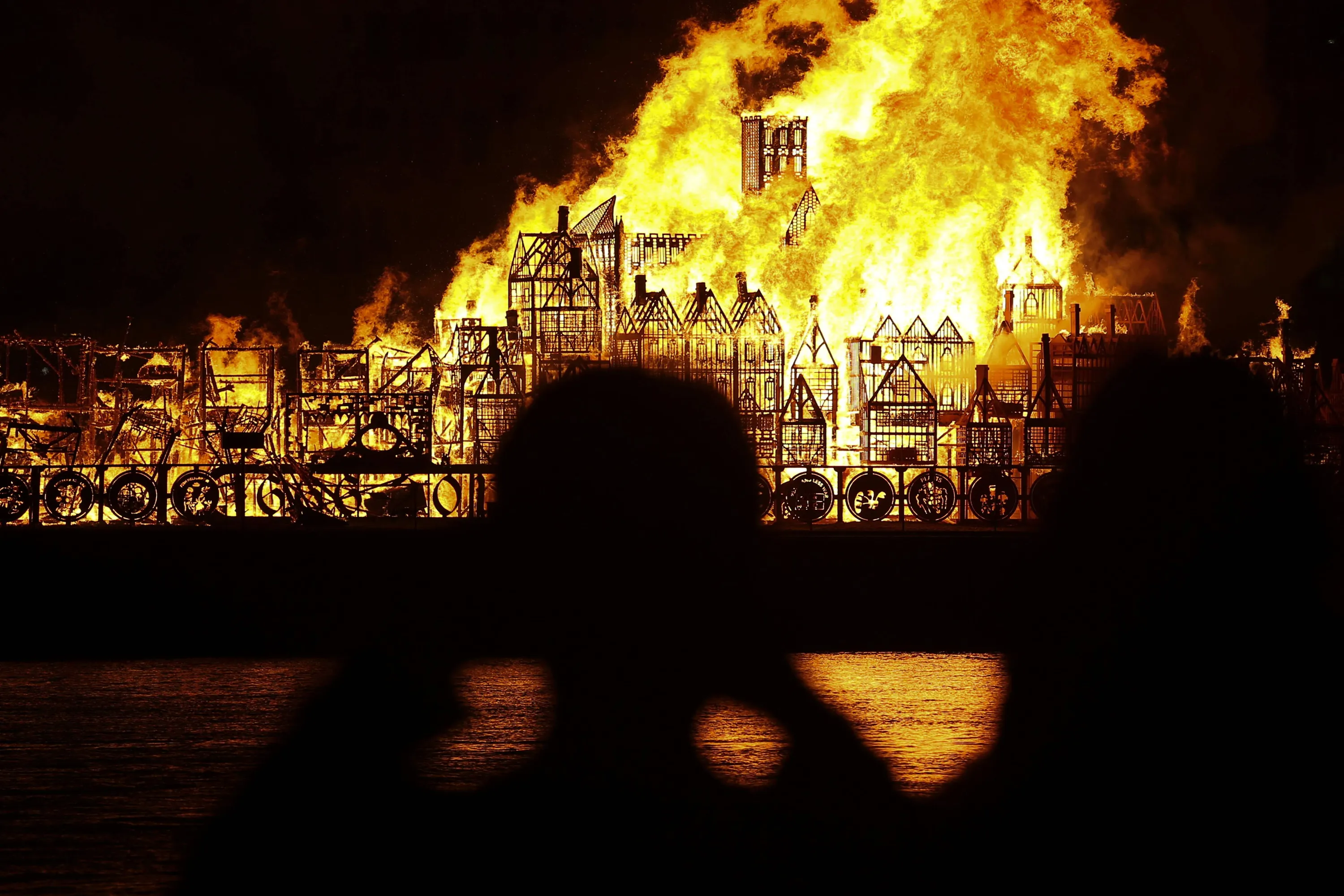 A replica of 17th-century London on a barge floating on the river Thames burns in an event to mark the 350th anniversary of the Great Fire of London, in London on September 4, 2016. A giant replica of 17th-century London was set ablaze on the Thames in the city to mark the 350th anniversary of the devastating Great Fire of London. The 1666 inferno destroyed most of the walled inner city dating back to Roman times – a bustling, congested maze of tightly-packed wooden houses. It forced London to rebuild anew from the ashes. (Photo by Justin Tallis/AFP Photo)