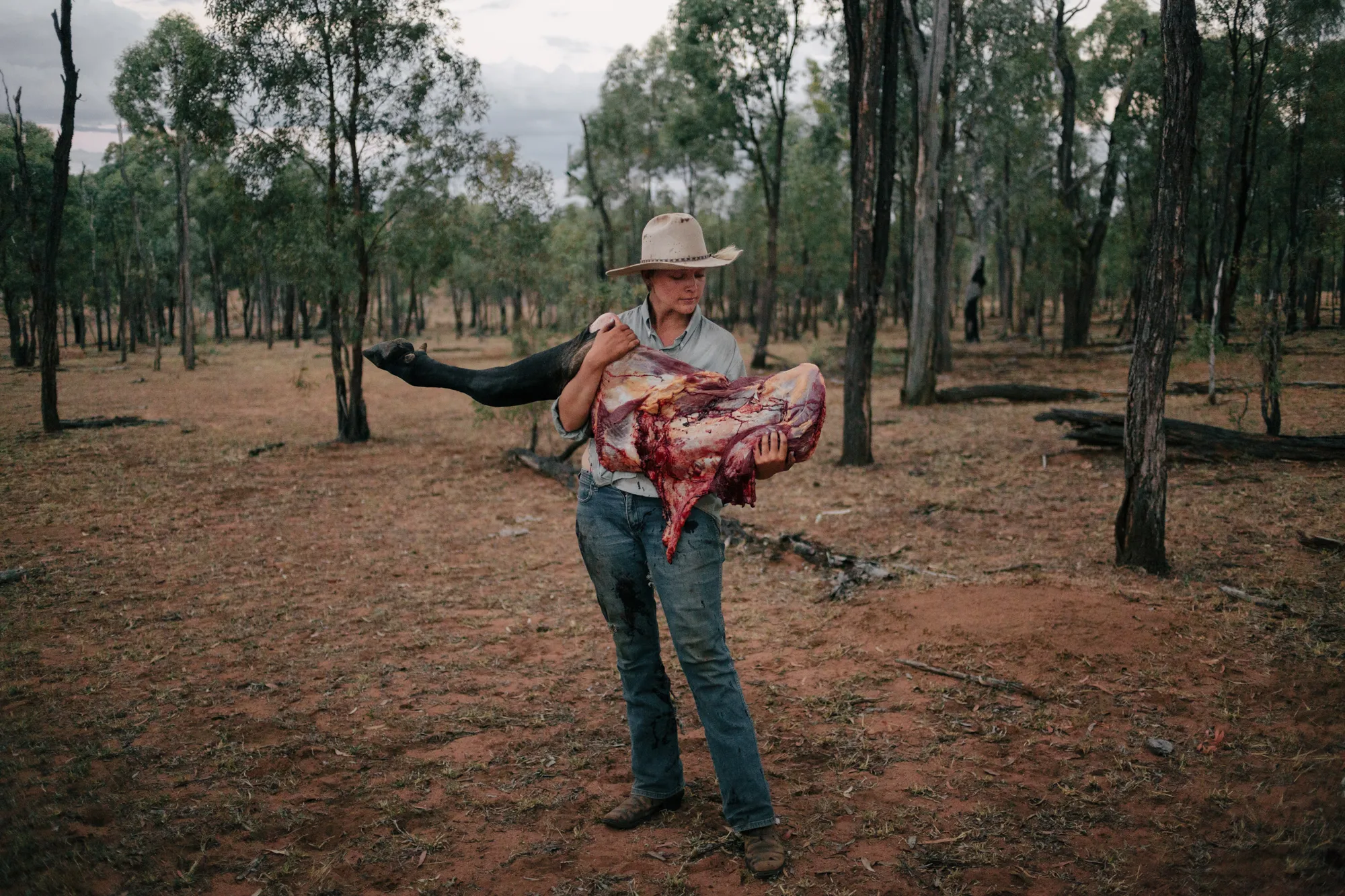 Station ringer Chloe Anderson holds the front leg of a freshly slaughtered animal in far north Queensland, Australia. The meat will serve as the station's food for the next 3 weeks. (Photo by Benjamin Rutherford)