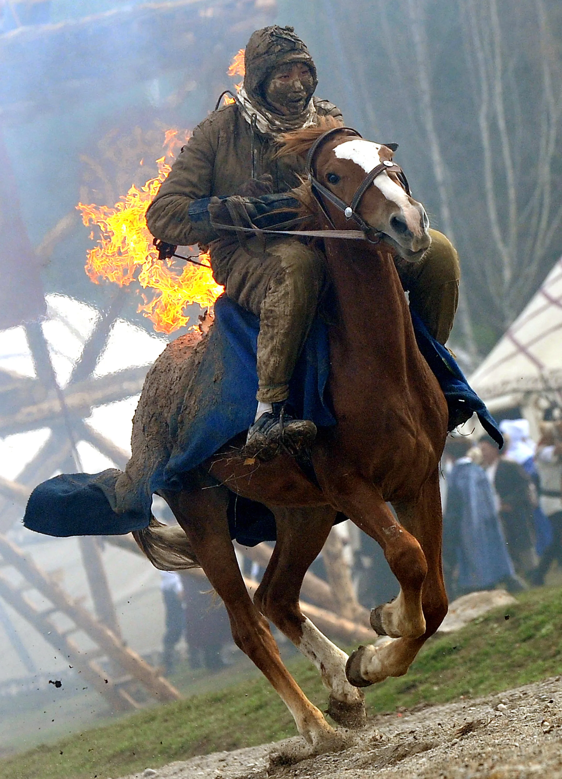 A rider performs at a feast in a specially built village setting, Kyrchin, at the 2016 World Nomad Games in Cholpon-Ata, Kyrgyzstan on September 4, 2016. (Photo by Viktor Drachev/TASS via Getty Images)