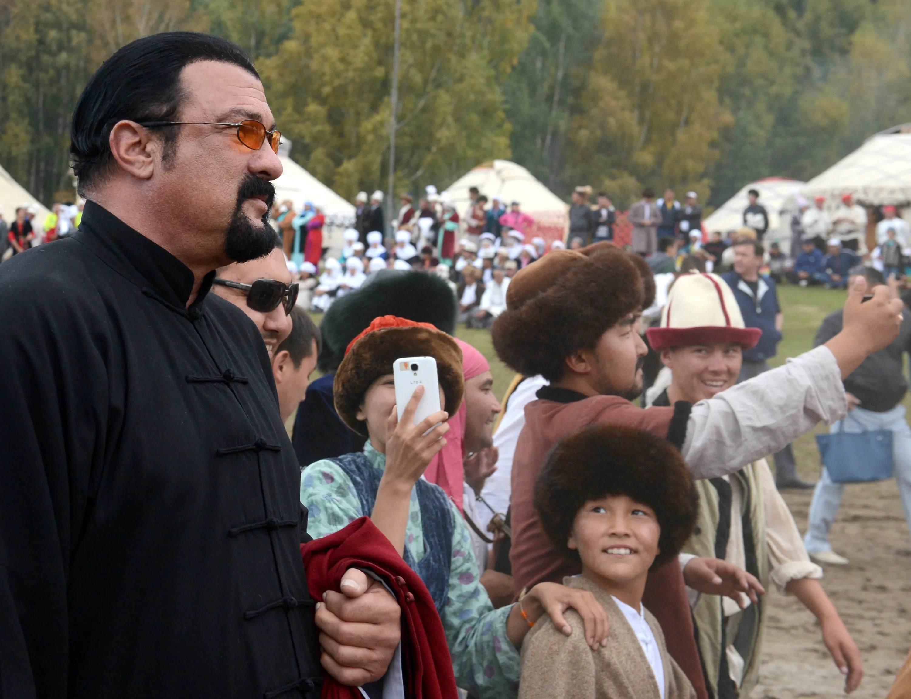 Hollywood actor Steven Seagal (L) and people in traditional dress in a specially built village setting, Kyrchin, at the 2016 World Nomad Games in Cholpon-Ata, Kyrgyzstan on September 4, 2016. (Photo by Viktor Drachev/TASS via Getty Images)