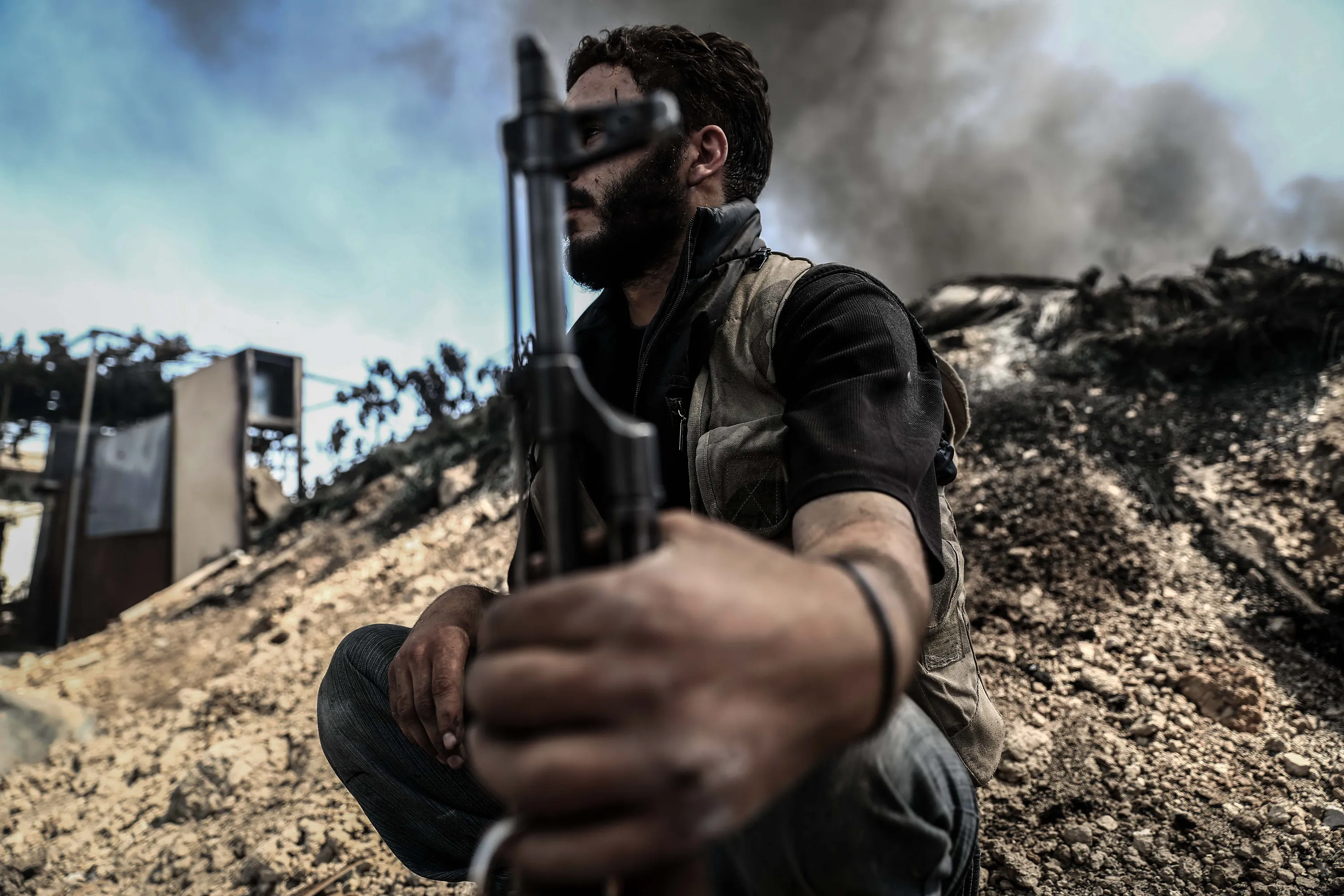 A fighter from the Jaish al-Islam (Islam Army) sits near smoke billowing on the front-line, which they use to take cover, in the village of Tal al-Siwan area of the rebel-held stronghold of Douma, on the outskirts of Damascus, on September 5, 2016. (Photo by Sameer Al-Doumy/AFP Photo)