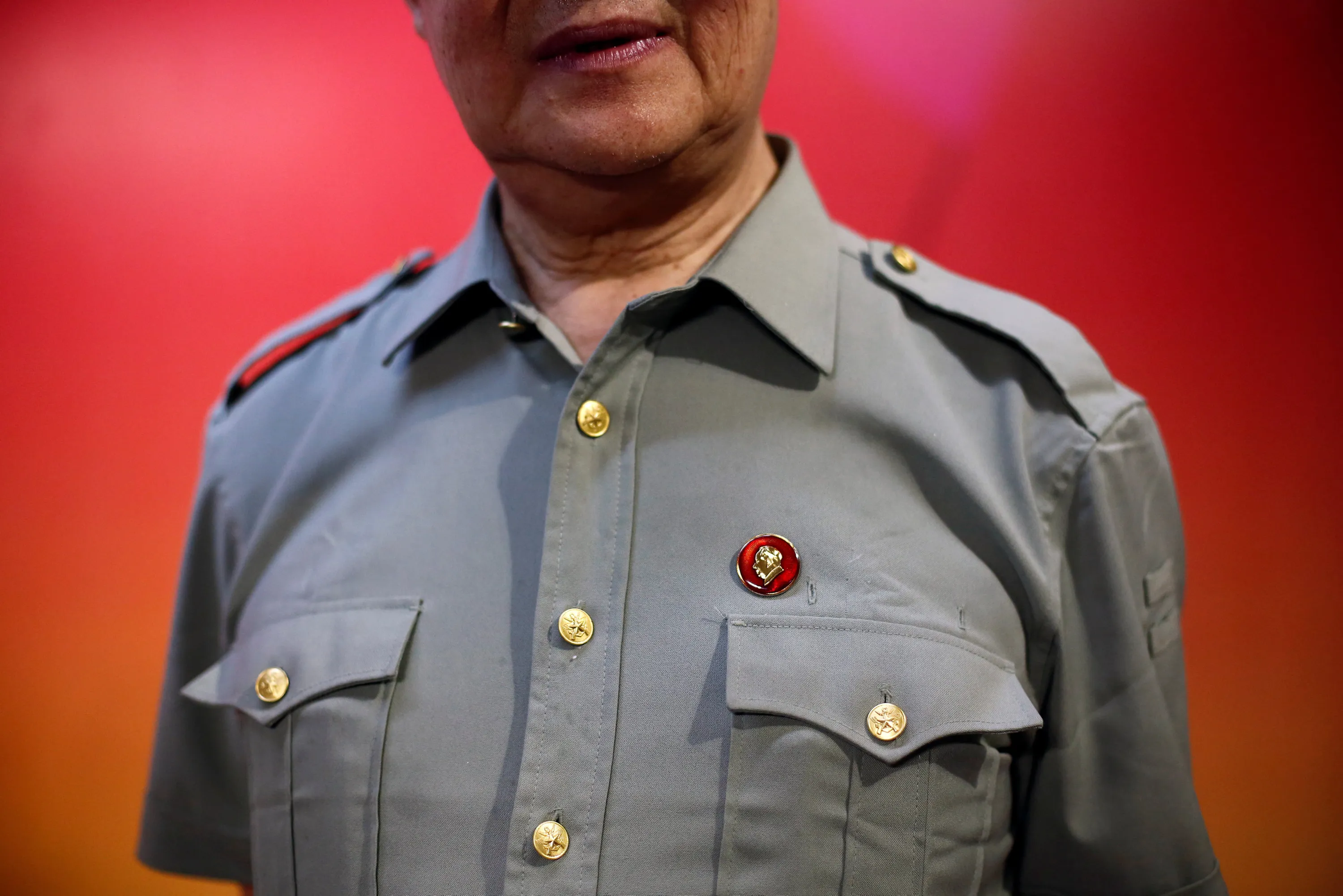 People's Liberation Army (PLA) officer Yao Werdong wears a pin with the portrait of late Chinese Chairman Mao Zedong during the opening of an exhibition of Mao related art in Beijing, China, September 8, 2016. (Photo by Thomas Peter/Reuters)