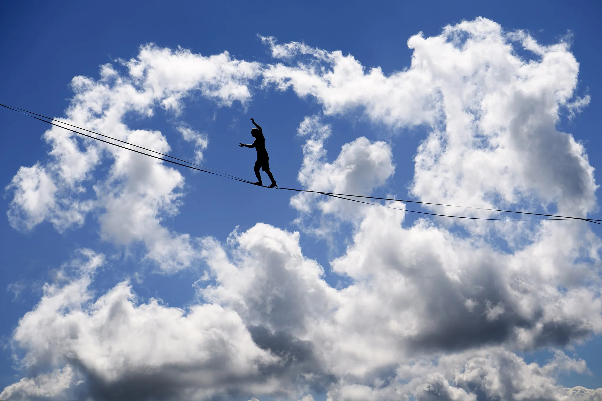 Swiss Samuel Volery, professional mountaineer, walks on the 585 meter line during the Highline Extreme event on top of the Moleson peak at 2000 meters above sea level in the Swiss Alps near Fribourg, Switzerland, Thursday, September 8, 2016. 25 of the European best slackliners compete until September 11, on 8 different lines ranging from 45 meters to 495 meters. To avoid the danger of falling down, the athlete is secured with a rope. (Photo by Laurent Gillieron/Keystone via AP Photo)