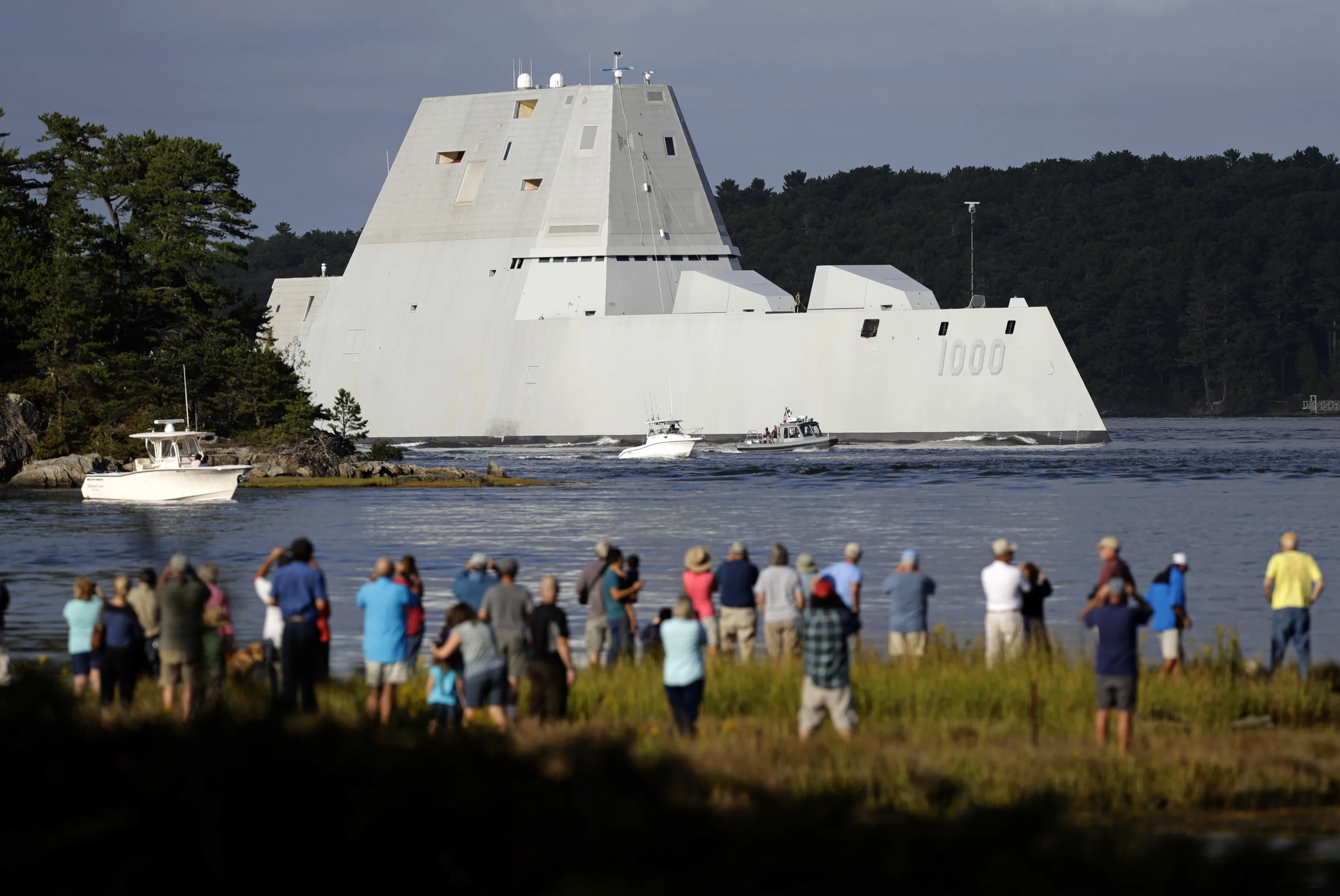 The future USS Zumwalt heads down the Kennebec River after leaving Bath Iron Works Wednesday, September 7, 2016, in Bath, Maine. The nation's biggest and most technologically sophisticated destroyer is going to join the Navy with half the normal crew size thanks to unprecedented automation. (Photo by Robert F. Bukaty/AP Photo)
